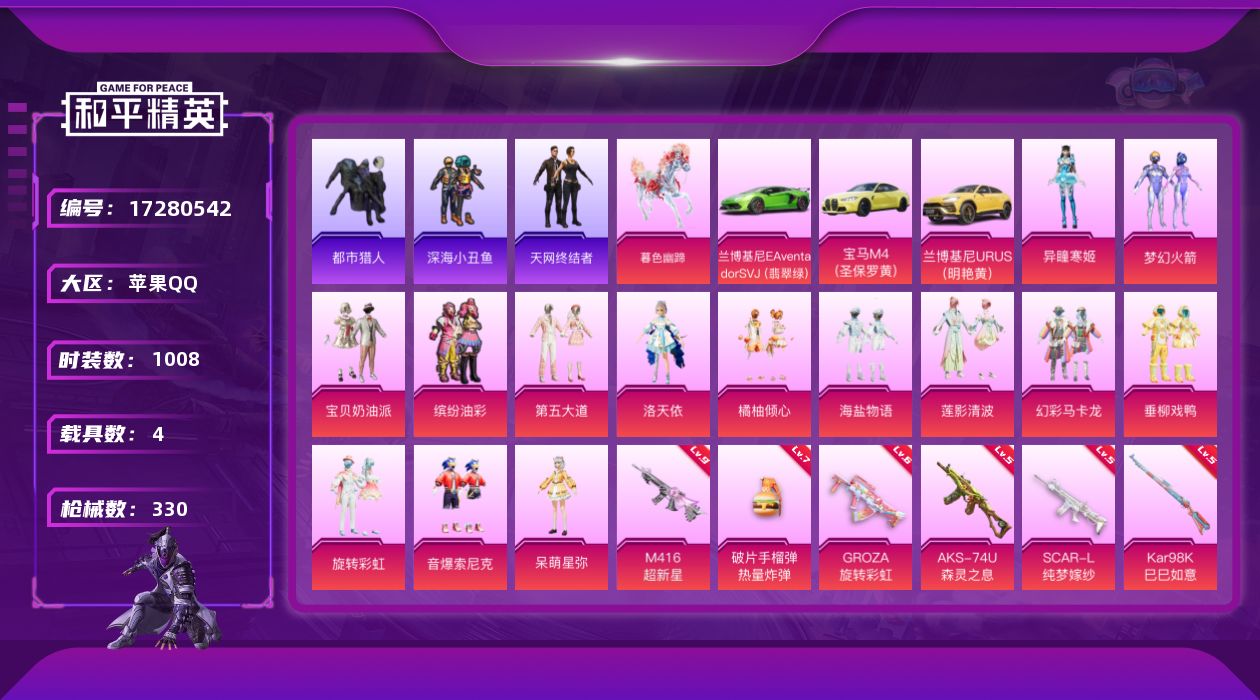 【506884】【可二次】【苹果QQ】龟仙人 大橘为重 AKM-星际浪客 漫步者 都市猎人 梦之光华飞行器 海盐物语 M249-彩虹甜喵 M416-心之恋语 缤纷油彩 深海小丑鱼 M416-超新星 GROZA-旋转彩虹 醒狮腾龙 纯白誓言 AKM-奇异狩猎者 兰博SVJ绿色 幻彩马卡龙 迅捷狂鲨 M762-瑞龙福将 潮萌小黄鸭 M417射手步枪 音爆索尼克 兰博SUV黄色 AKM-炫紫旋律 白月
