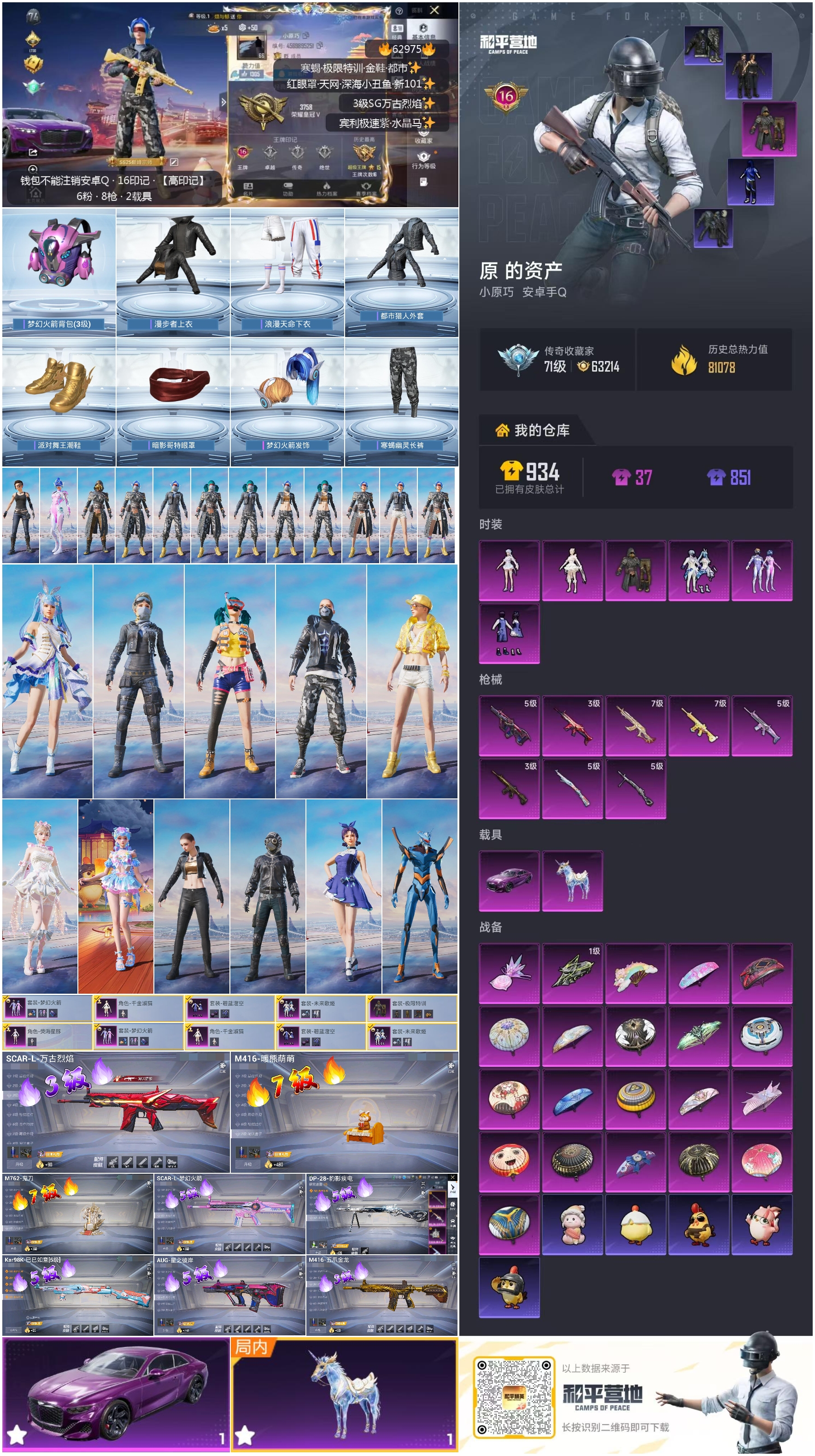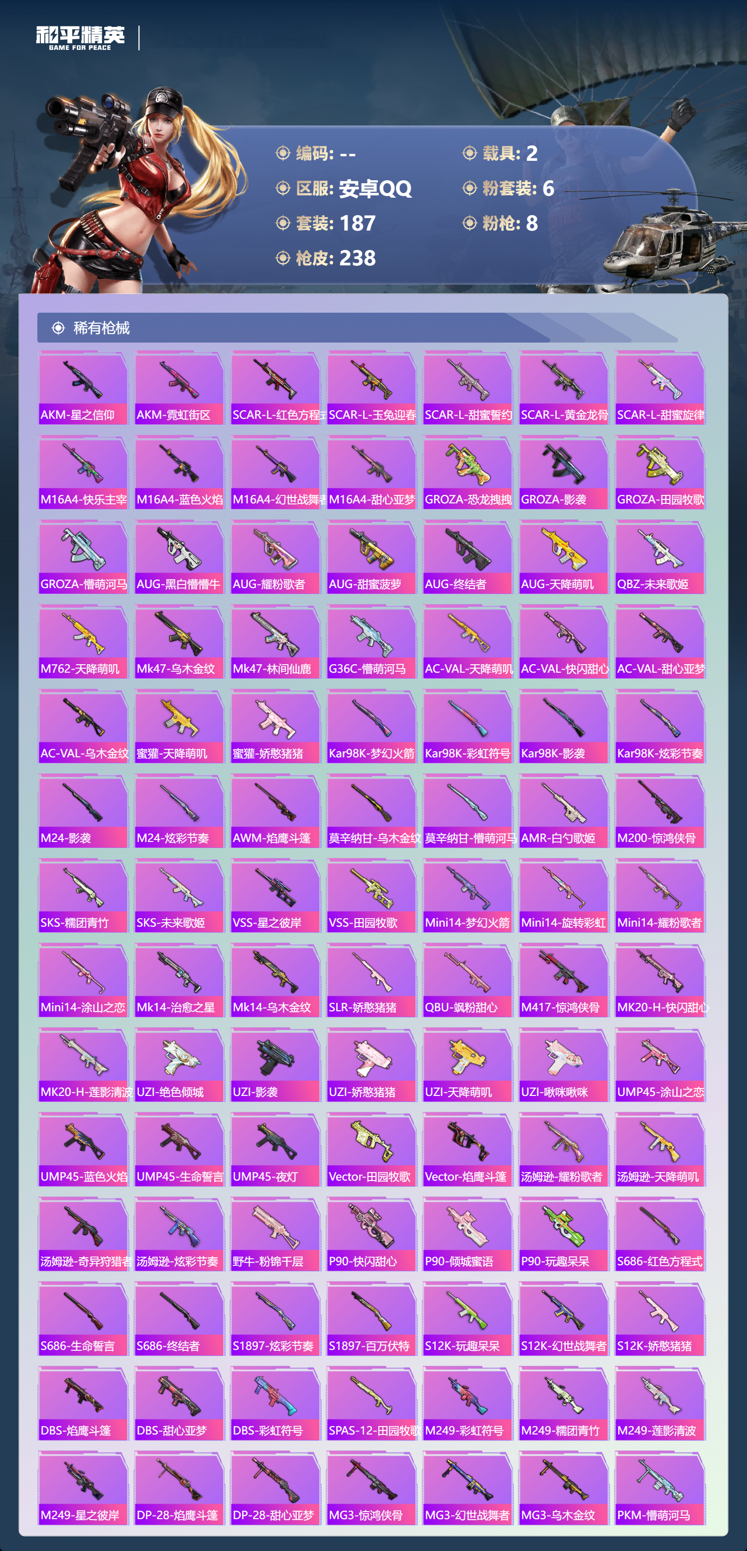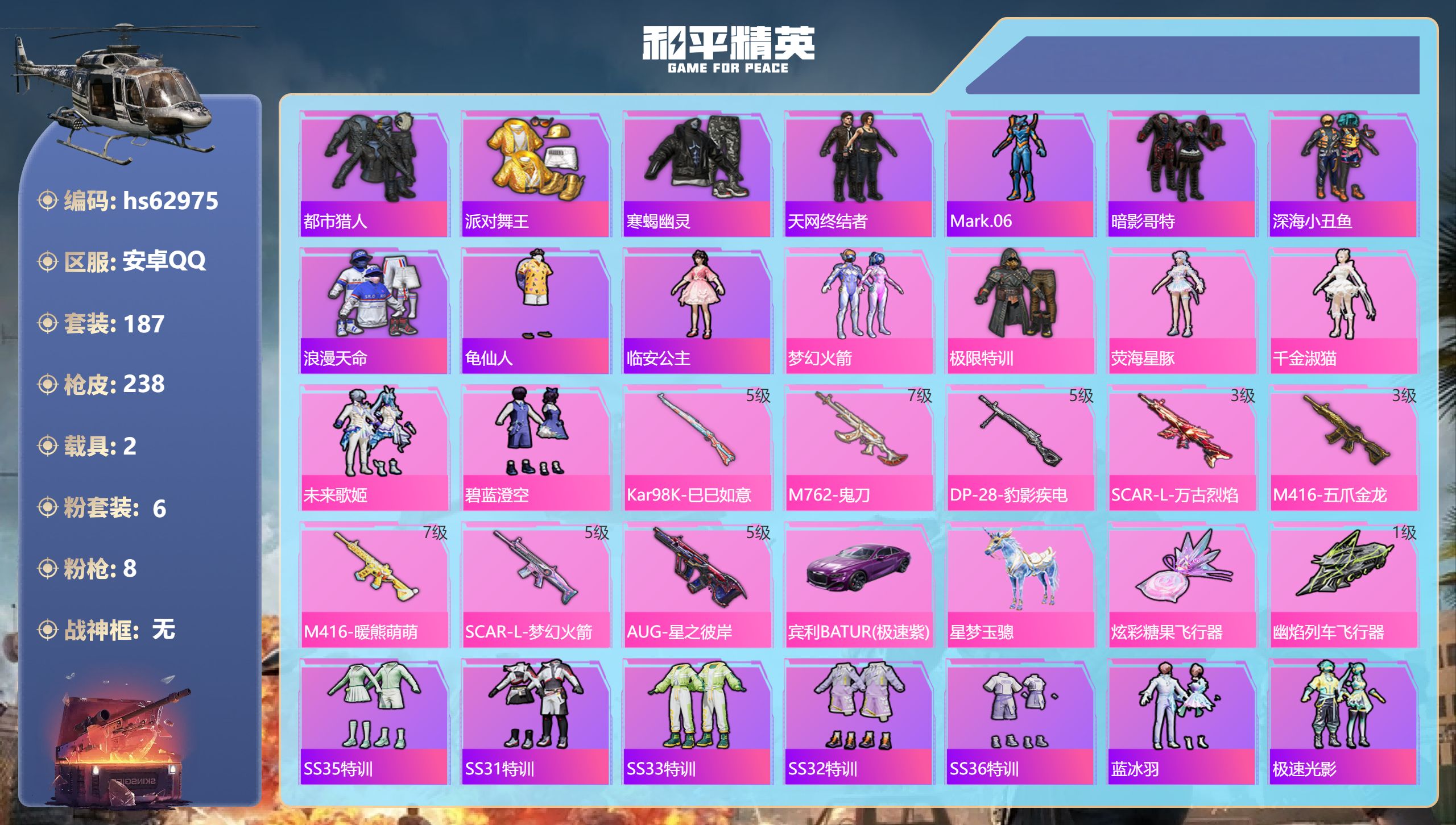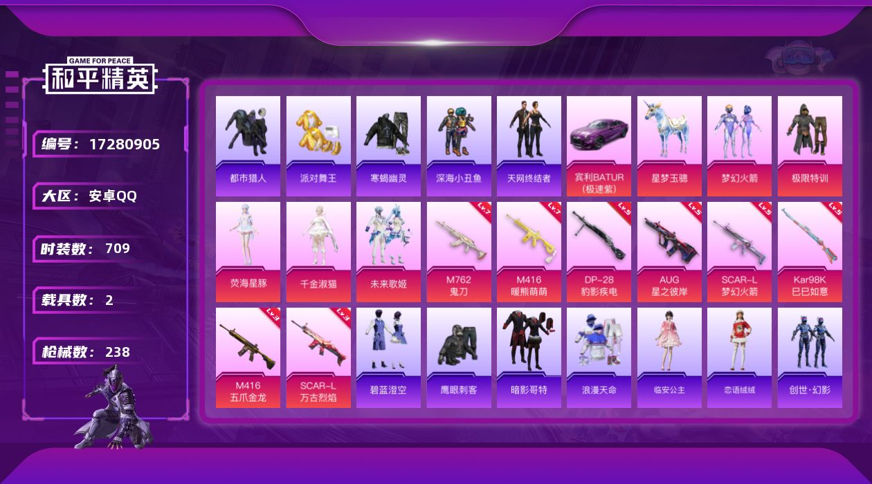 【506966】【可二次】【安卓QQ】SCAR-L-梦幻火箭 龟仙人 星梦玉骢 M416-五爪金龙 漫步者 都市猎人 SCAR-L梦幻火箭 极限特训 寒蝎幽灵 SCAR-L-万古烈焰 梦幻火箭 MK47-林间仙鹿 M416-暖熊萌萌 AKM-百万伏特 粉红小猪 深海小丑鱼 派对舞王 AUG-星之彼岸 浪漫天命 暗影哥特 纯白誓言