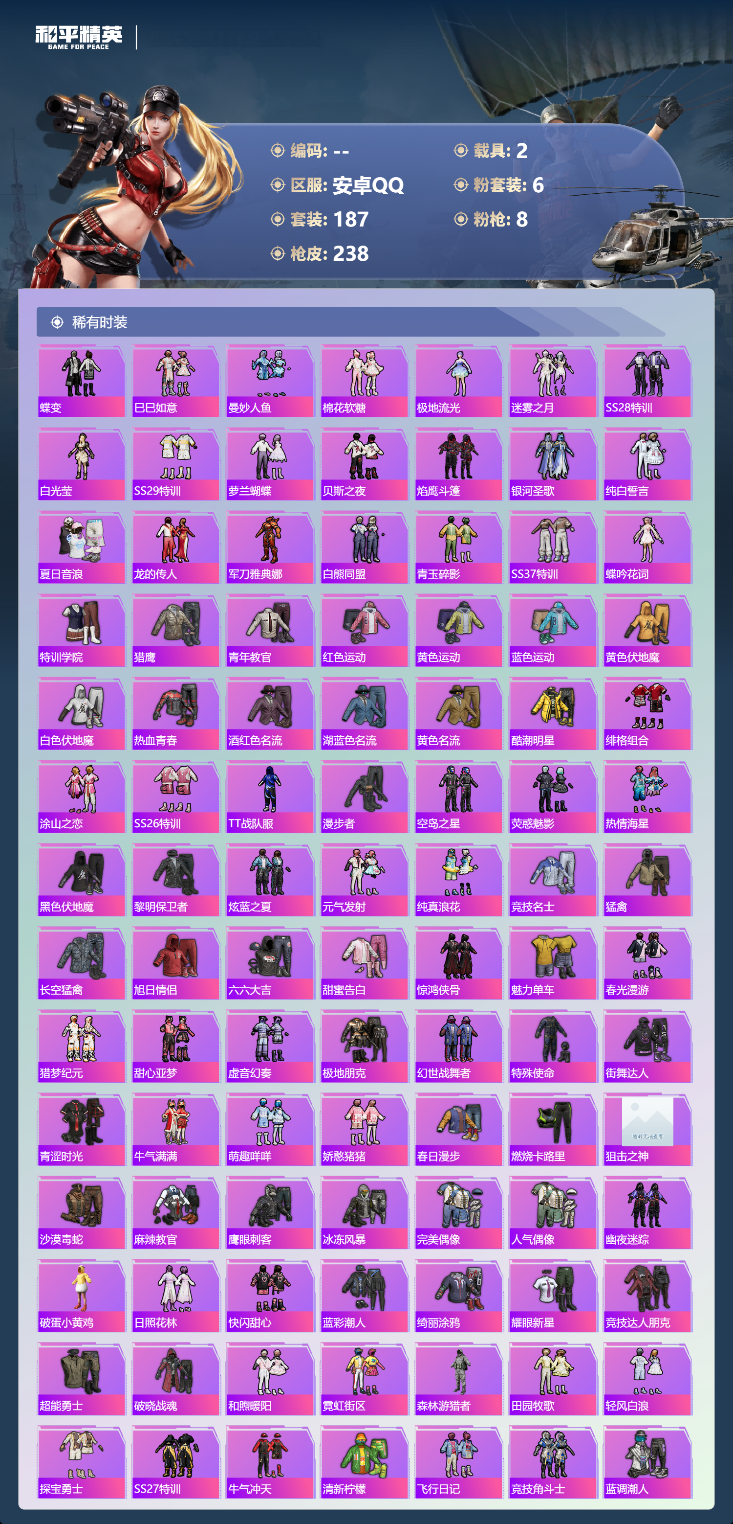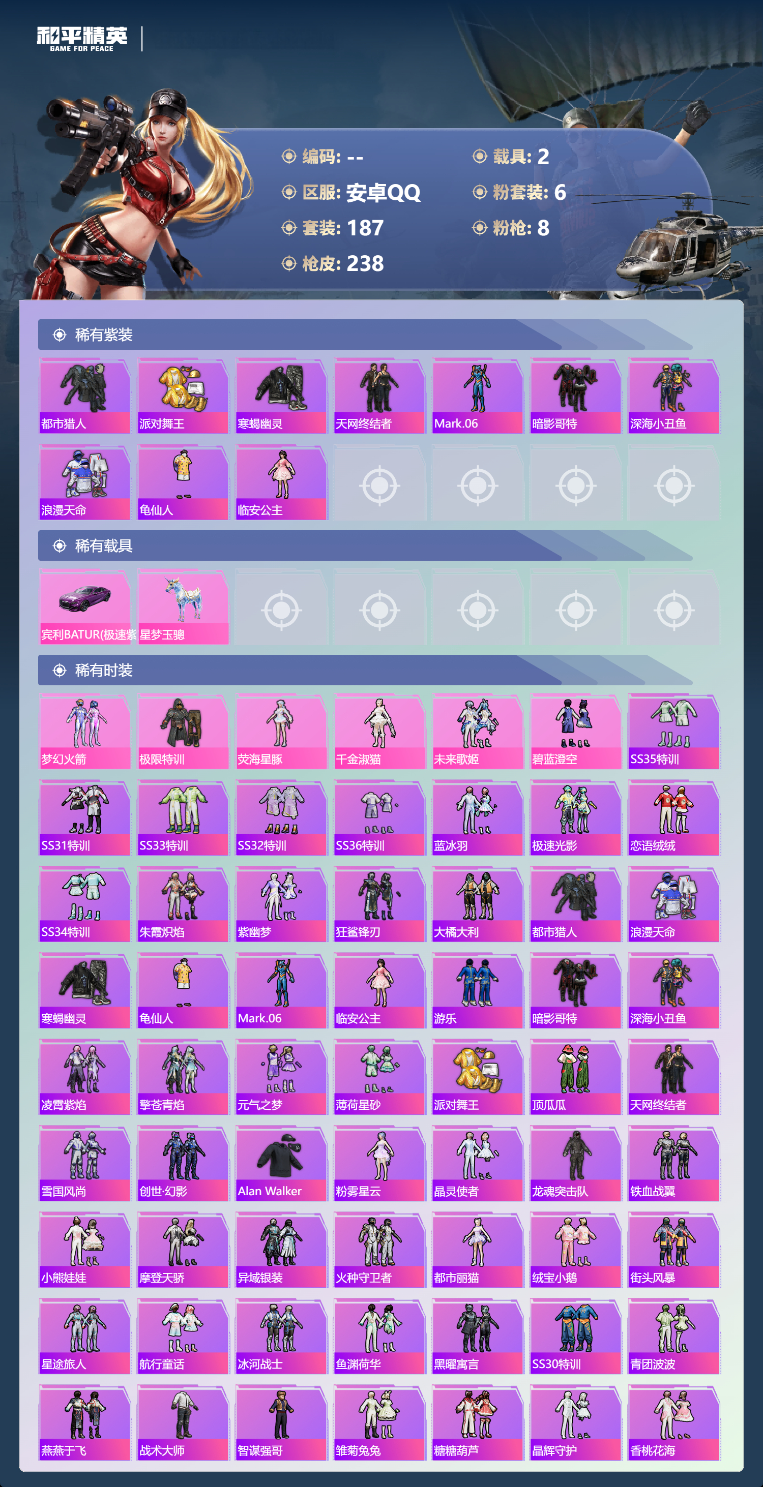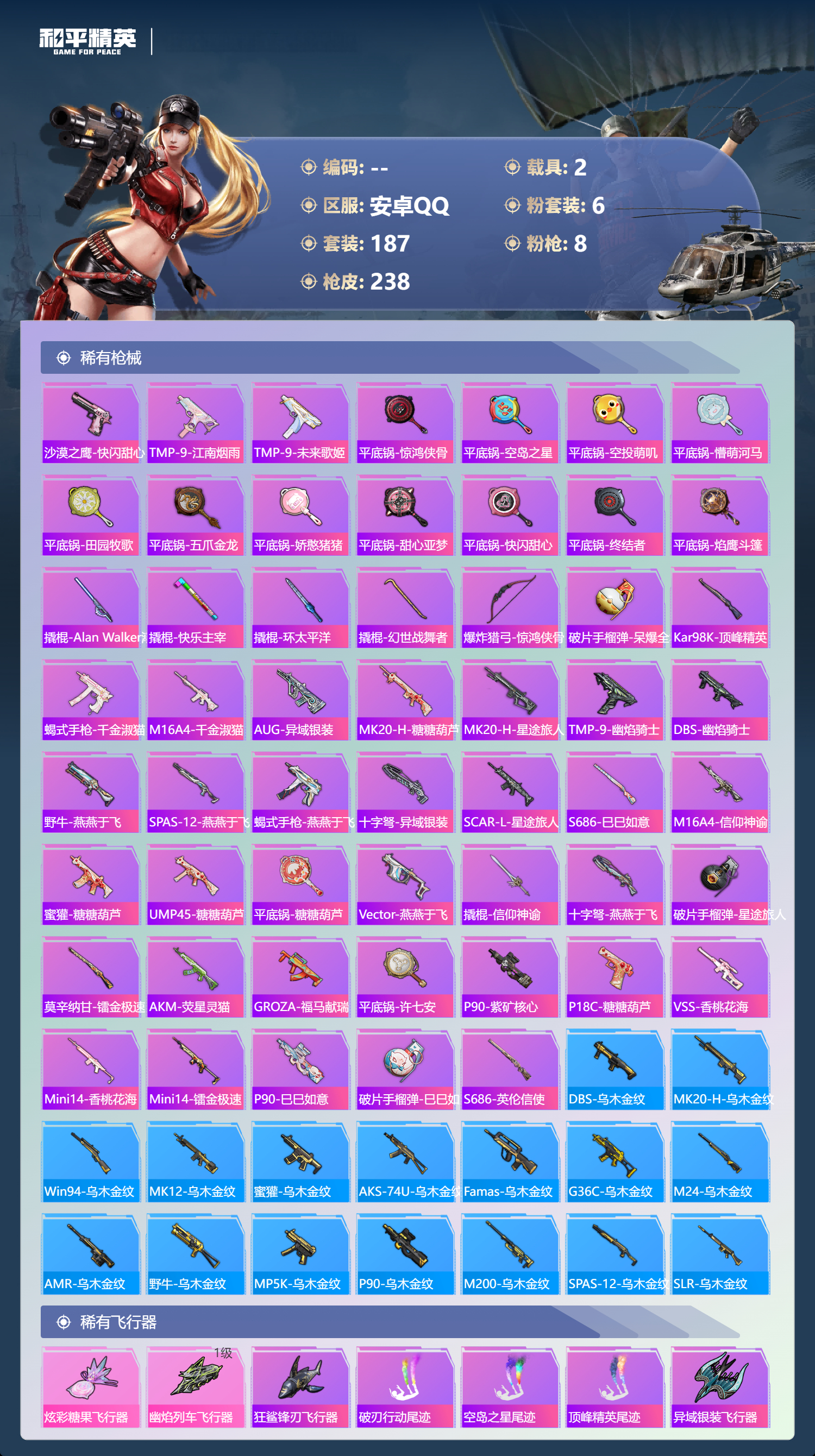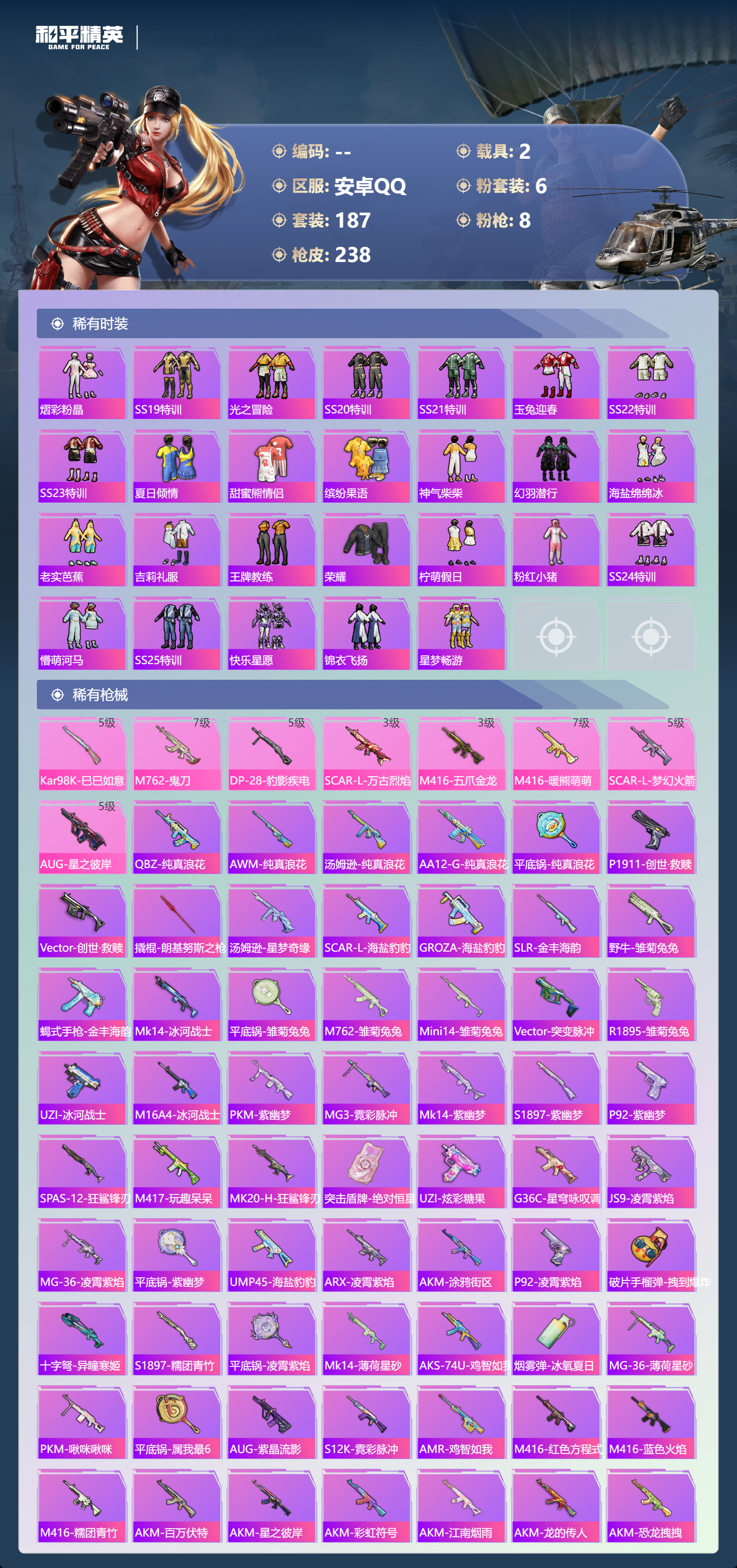 【506966】【可二次】【安卓QQ】SCAR-L-梦幻火箭 龟仙人 星梦玉骢 M416-五爪金龙 漫步者 都市猎人 SCAR-L梦幻火箭 极限特训 寒蝎幽灵 SCAR-L-万古烈焰 梦幻火箭 MK47-林间仙鹿 M416-暖熊萌萌 AKM-百万伏特 粉红小猪 深海小丑鱼 派对舞王 AUG-星之彼岸 浪漫天命 暗影哥特 纯白誓言