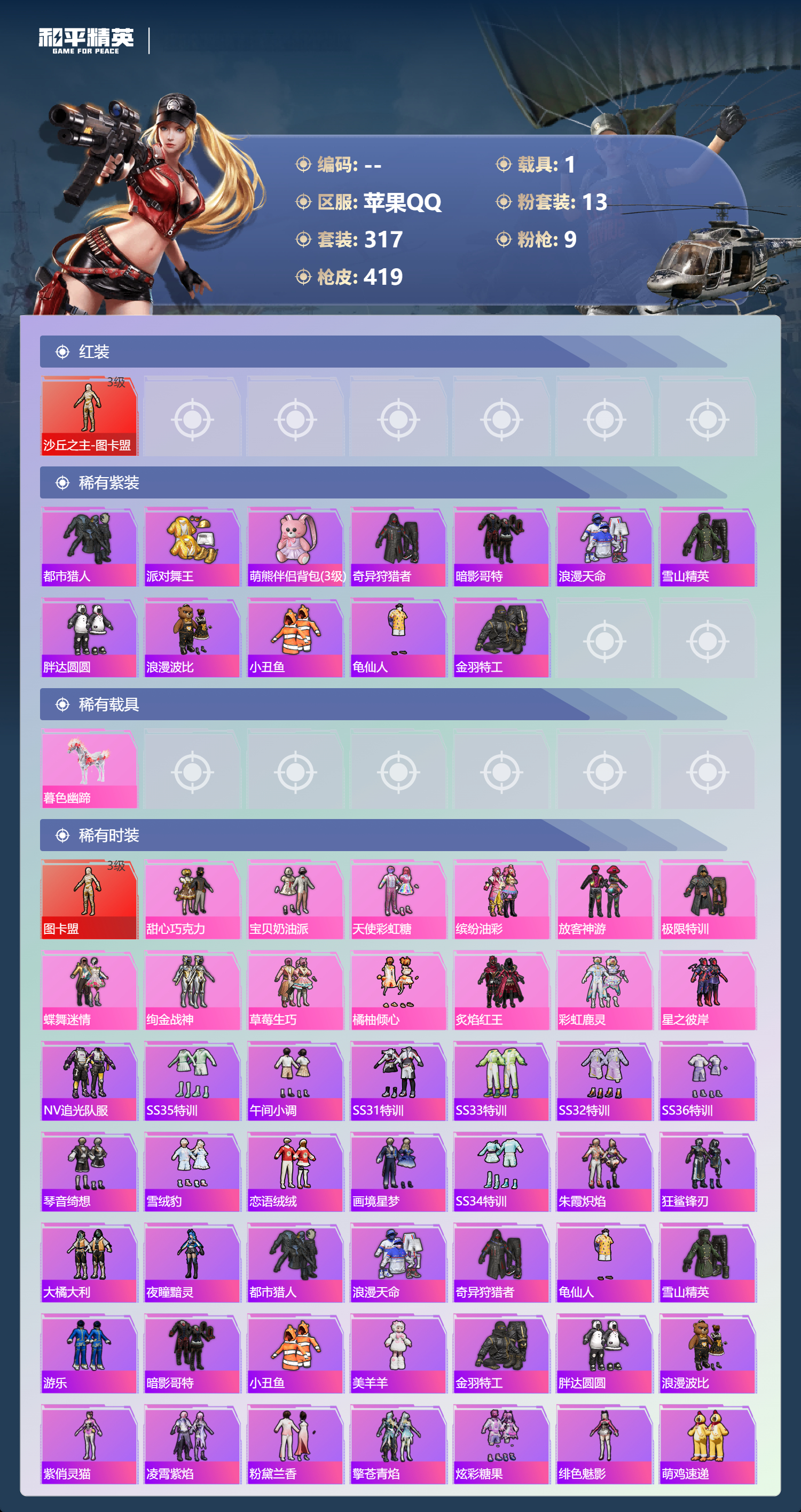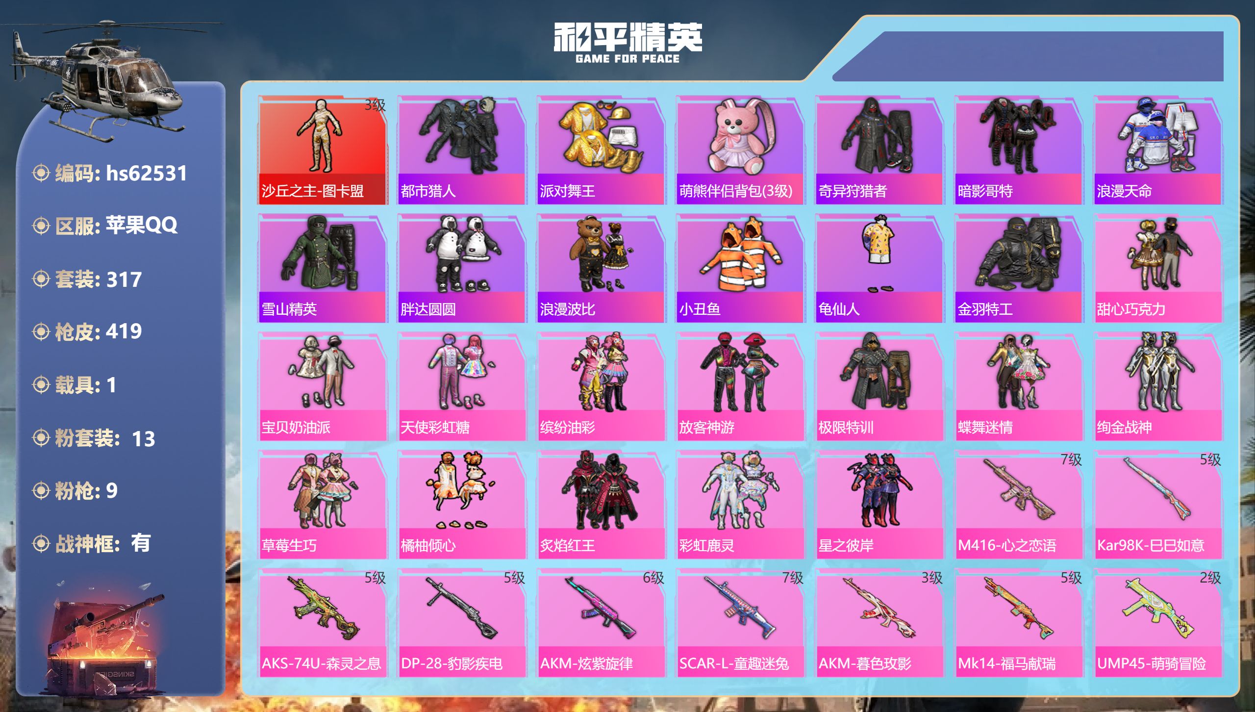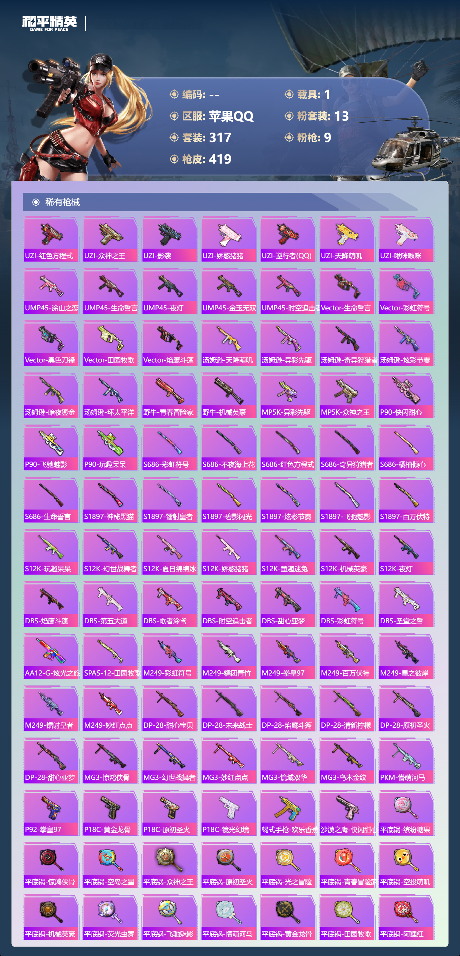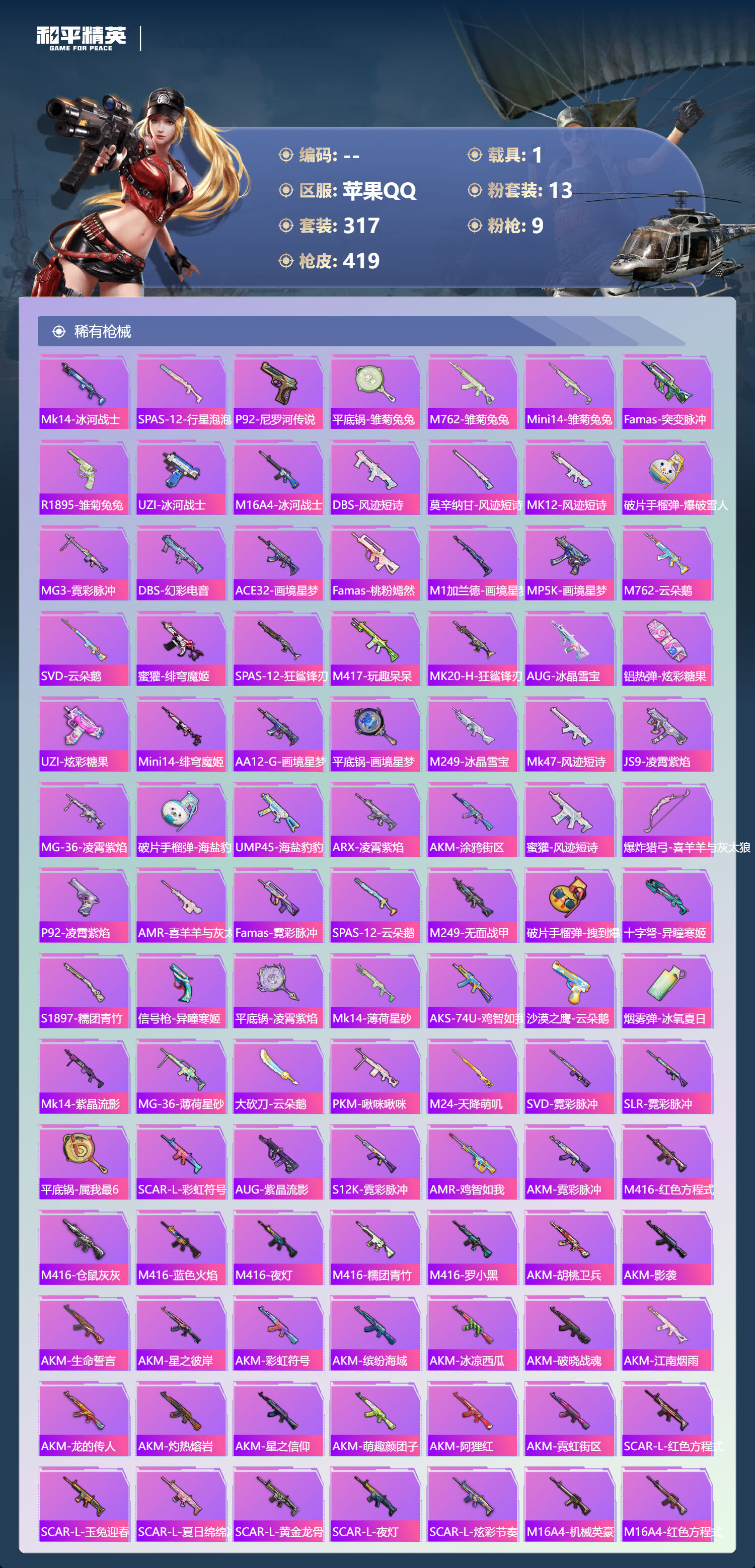 【510250】【不可二次】【苹果QQ】龟仙人 水银刺客 漫步者 都市猎人 忍者信条 M762-奇异狩猎者 沙丘之主-图卡盟 M416-仓鼠灰灰 GROZA-林间仙鹿 M416-心之恋语 缤纷油彩 浪漫波比 SCAR-童趣迷兔 AWM-激战未来 蝶舞迷情 AWM-黄金龙骨 SS1特训 潮萌小黄鸭 黑色刀锋 狂沙舞者 金羽特工 AKM-炫紫旋律 白月香洋装 草莓生巧 S686-奇异狩猎者 炙焰红王