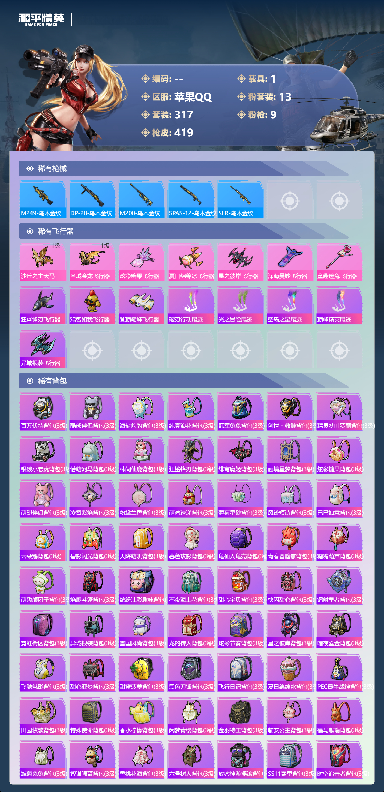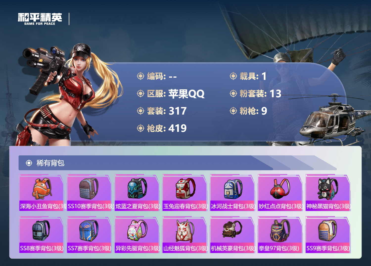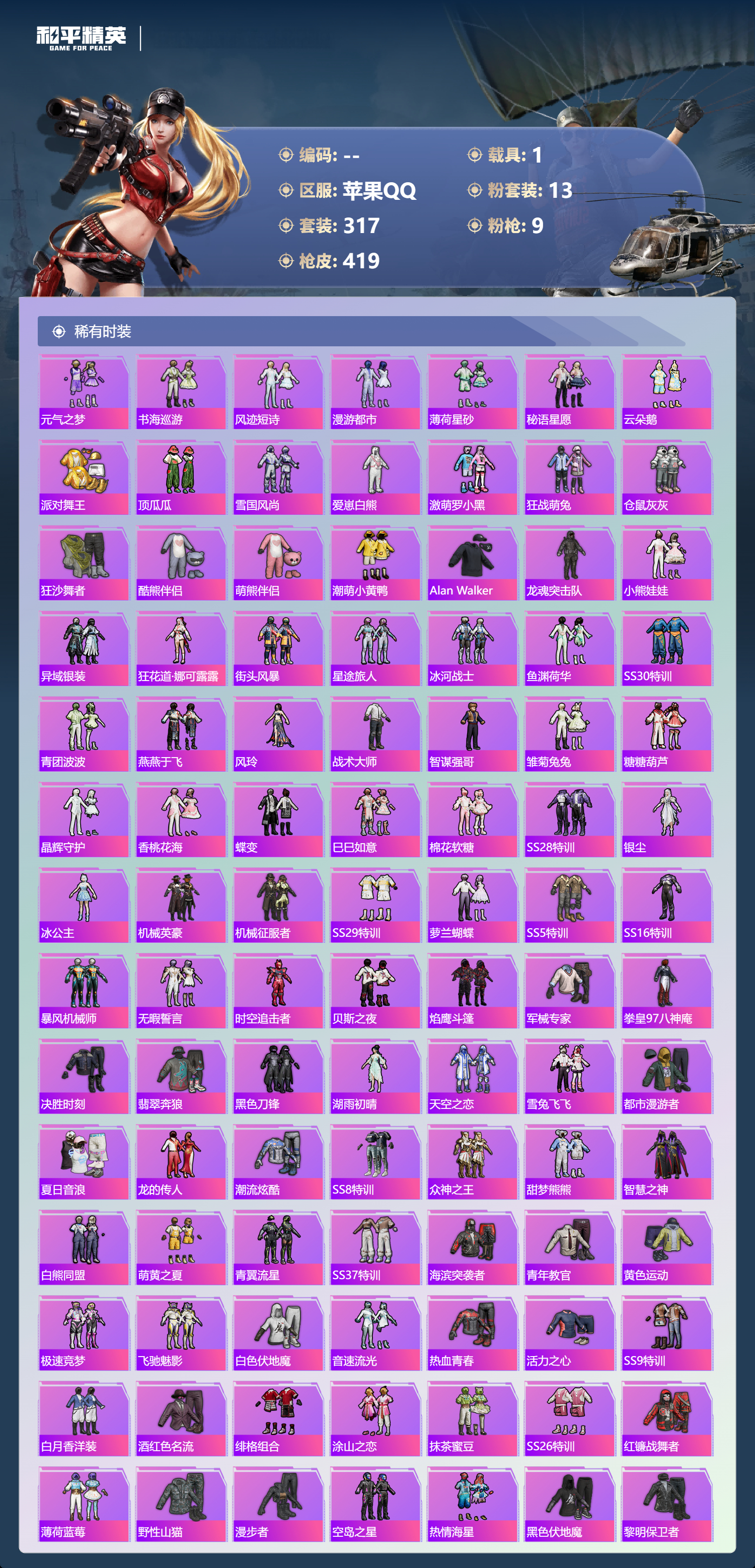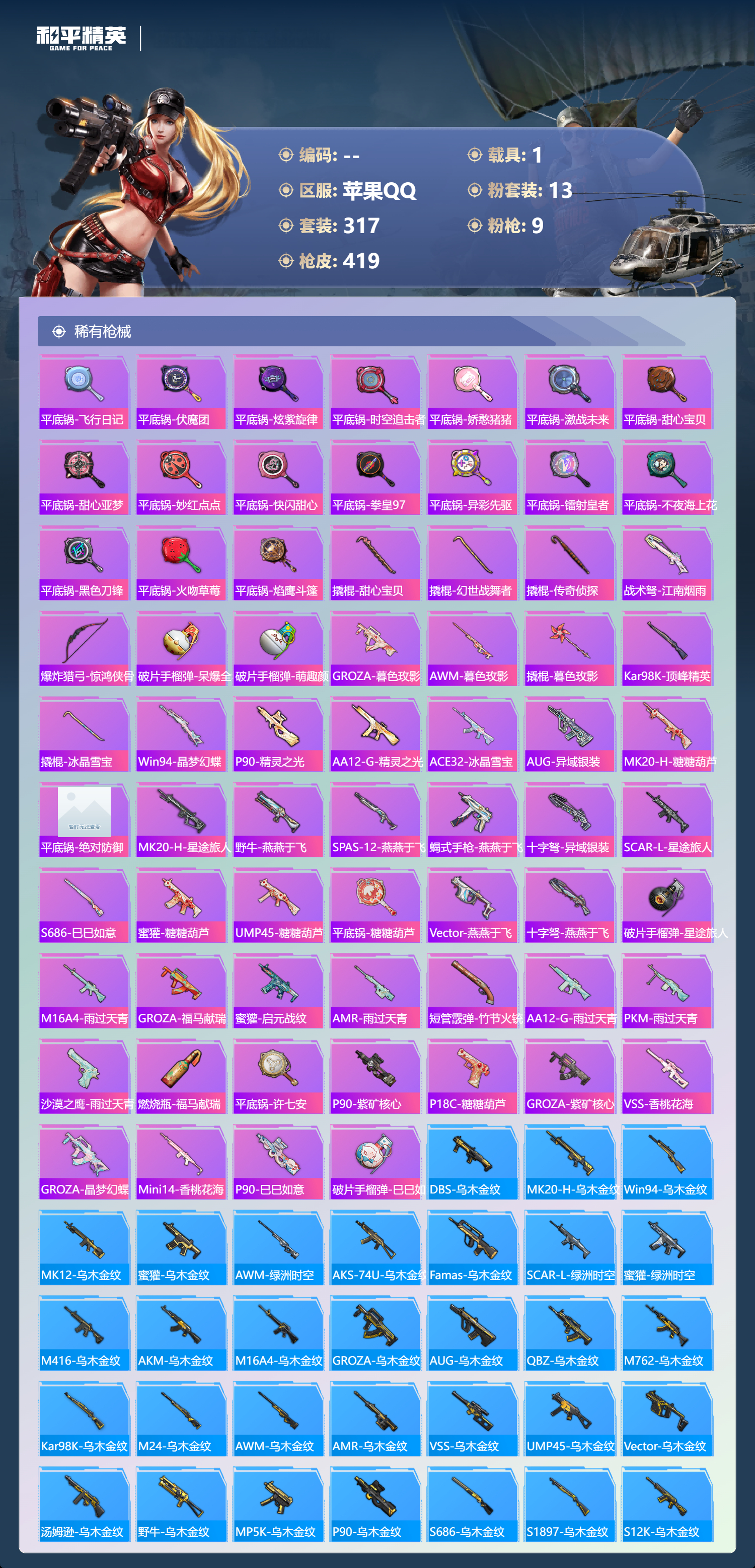 【510250】【不可二次】【苹果QQ】龟仙人 水银刺客 漫步者 都市猎人 忍者信条 M762-奇异狩猎者 沙丘之主-图卡盟 M416-仓鼠灰灰 GROZA-林间仙鹿 M416-心之恋语 缤纷油彩 浪漫波比 SCAR-童趣迷兔 AWM-激战未来 蝶舞迷情 AWM-黄金龙骨 SS1特训 潮萌小黄鸭 黑色刀锋 狂沙舞者 金羽特工 AKM-炫紫旋律 白月香洋装 草莓生巧 S686-奇异狩猎者 炙焰红王