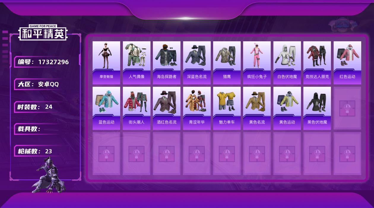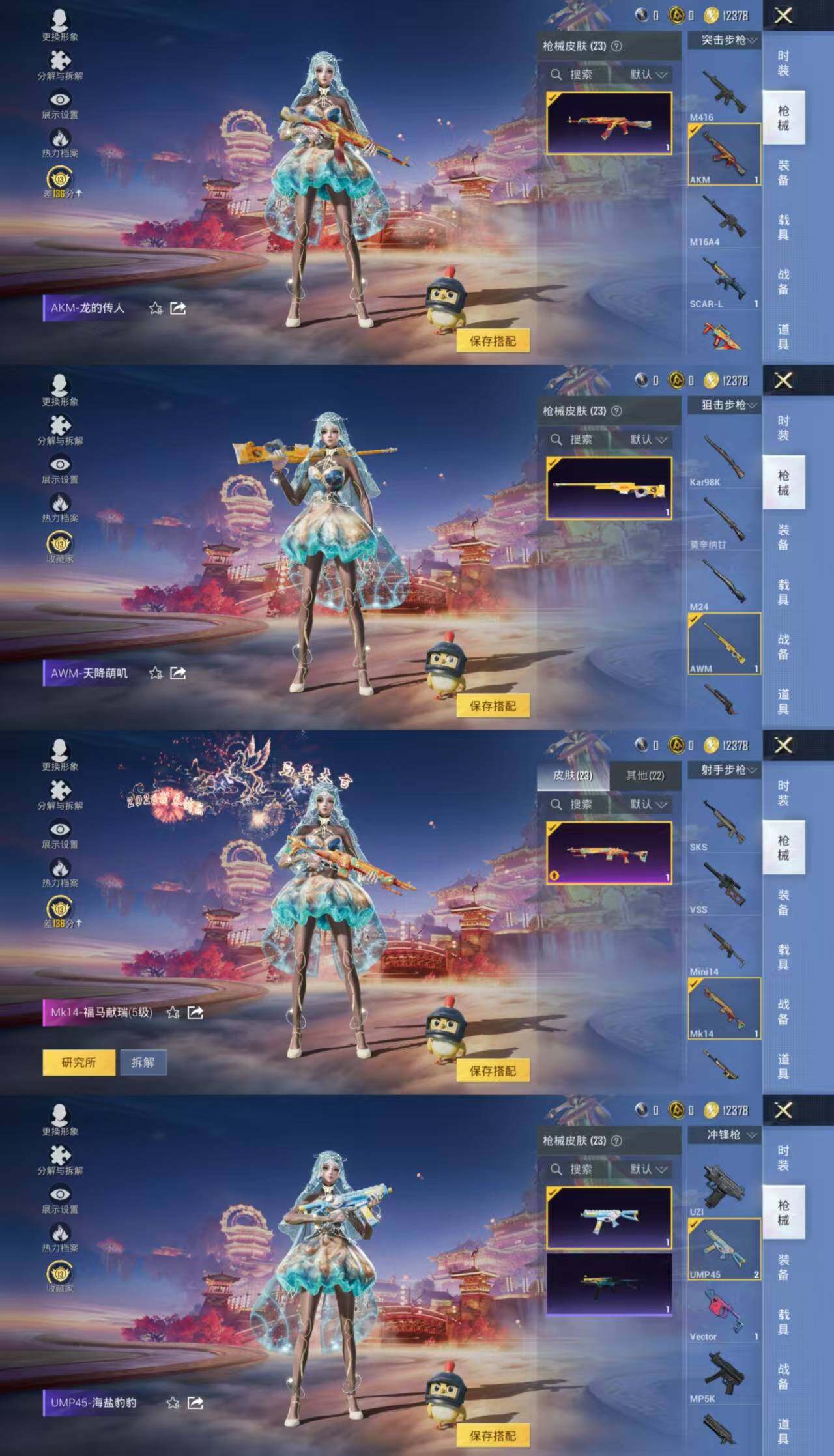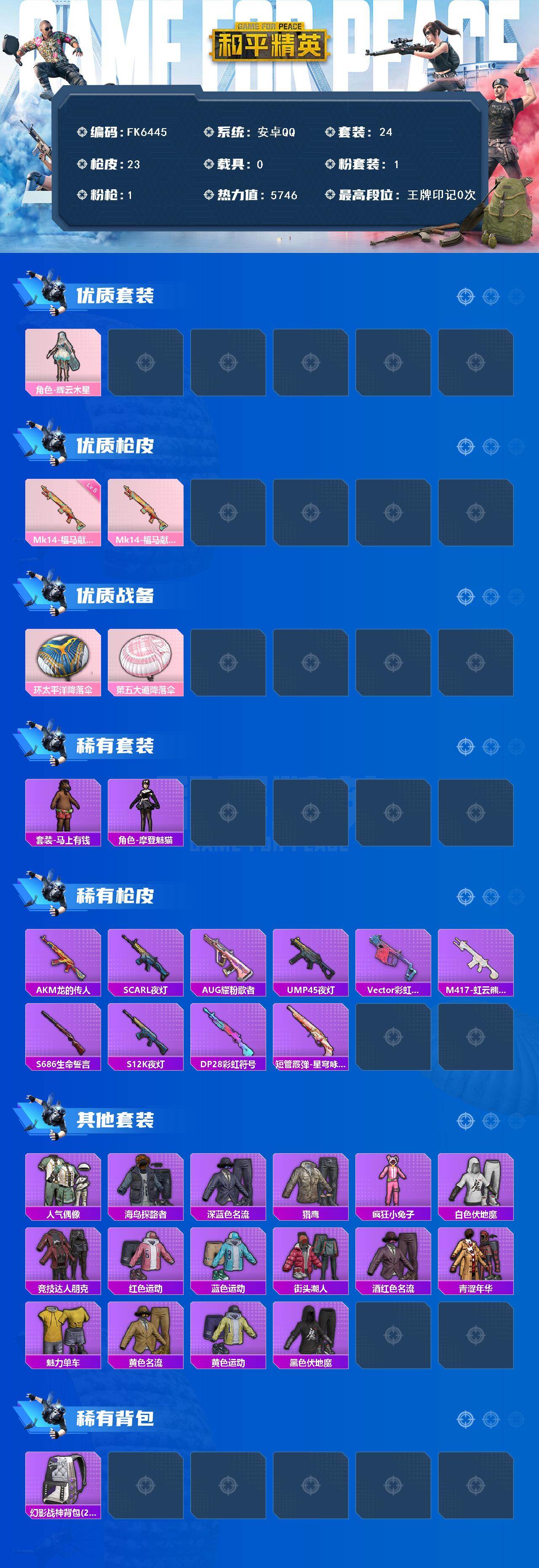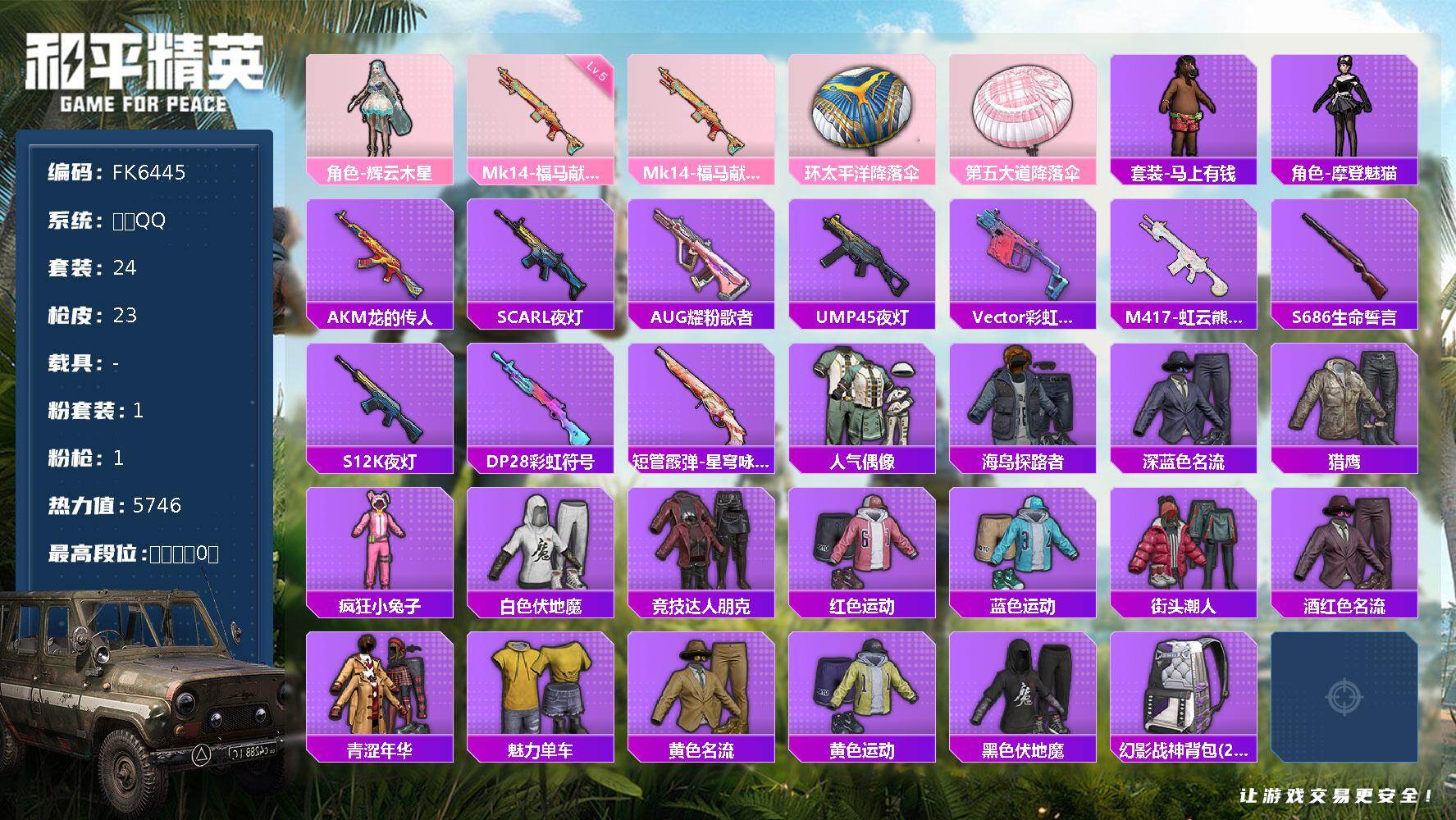 【513273】[17327296]【FK6445】24套装/枪械1/装备21/战备23/热力值5746/五级Mk14-福马献瑞/角色-辉云木星/Mk14-福马献瑞/环太平洋降落伞/第五大道降落伞/套装-马上有钱/摩登魅猫/AKM-龙的传人/SCAR-L-夜灯/AUG-耀粉歌者/UMP45-夜灯/Vector-彩虹符号/M417-虹云熊熊/S686-生命誓言/S12K-夜灯/DP-28-彩虹符号