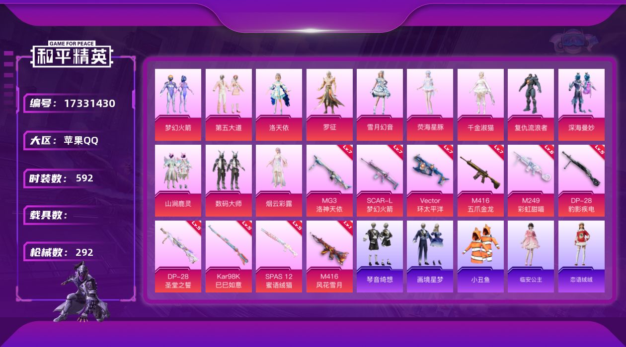 【513969】【不可二次】【苹果QQ】SCAR-L-梦幻火箭 龟仙人 深海曼妙 M416-五爪金龙 DP-28-圣堂之誓 M762-瑞龙福将 齐天大圣飞行器 SCAR-L梦幻火箭 Vector-环太平洋 MG3-洛神天依 洛天依 Mini14-林间仙鹿 M416-风花雪月 M249-彩虹甜喵 梦幻火箭 GROZA-林间仙鹿 AKM-百万伏特 粉红小猪 数码大师 山涧鹿灵 瑞龙福将 醒狮腾龙 梦