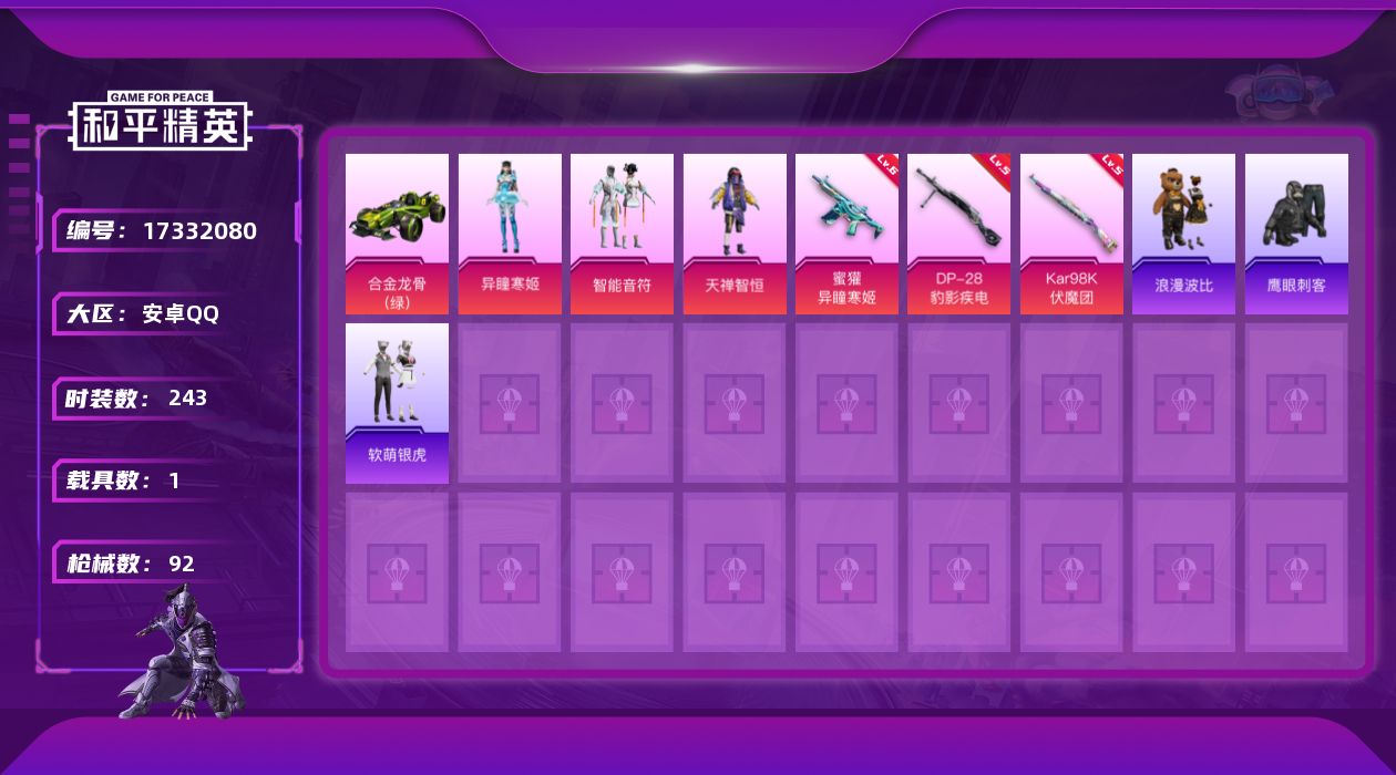 【514433】【可二次】【安卓QQ】软萌银虎 合金龙骨绿色 M249-古堡领主 浪漫波比 天禅智恒 智能音符 风华少年志 Kar98K-伏魔团 98K-伏魔团