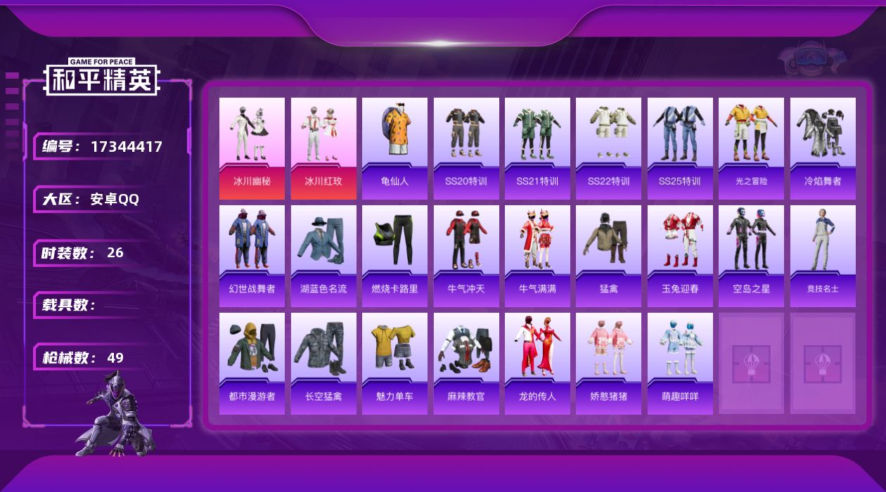 【515987】[17344417]安卓 手Q-2粉装-0特效枪-0载具-10903热力值-1印记-26套装-49枪皮【优质套装】:粉装-冰川幽秘,粉装-冰川红玫【稀有套装】:套装-龟仙人【稀有武器皮肤】:AKM-环太平洋,AKM-破晓战魂,AKM-龙的传人,M16A4-幻世战舞者,M16A4-红色方程式,SCAR-L-玉兔迎春,M416-红色方程式,GROZA-彩虹符号,AUG-冰川粉黛,AU