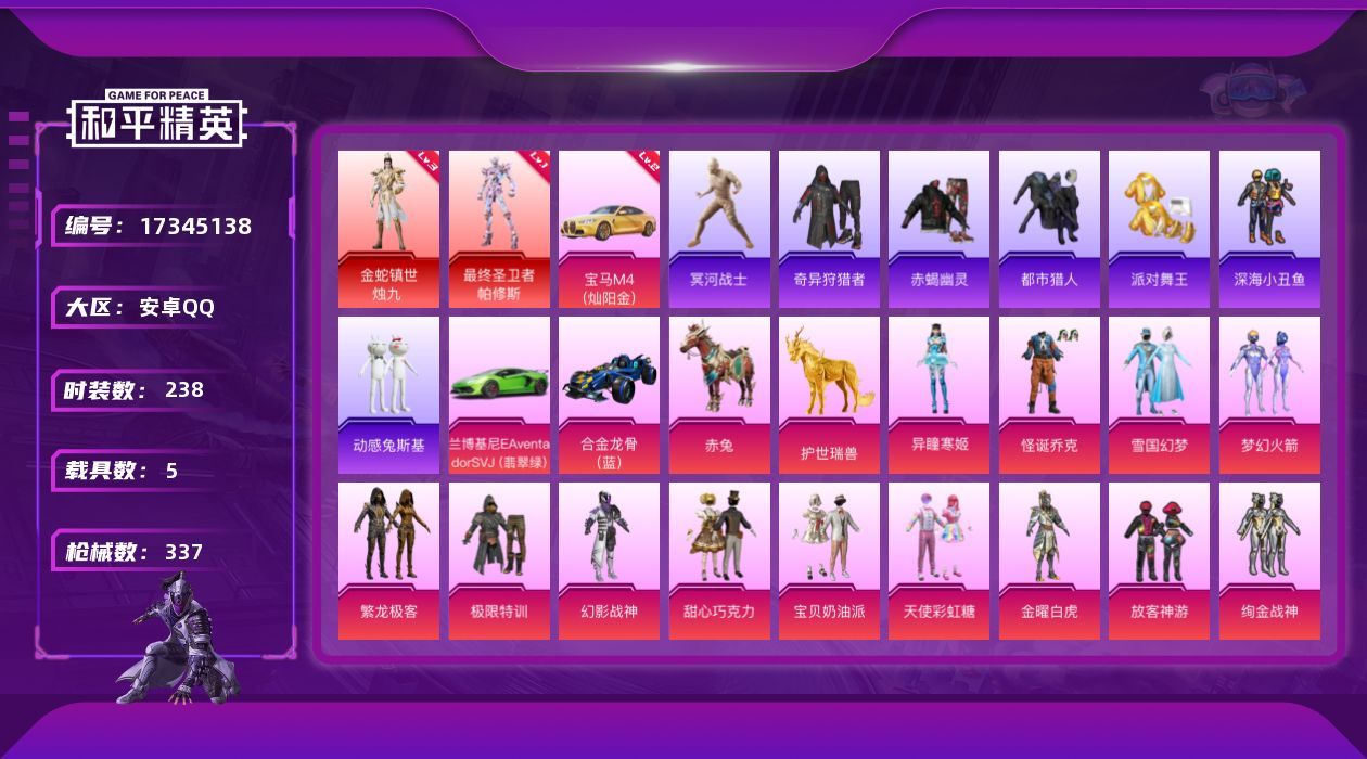 【516089】【可二次】【安卓QQ】合金龙骨蓝色 木乃伊 暗星紫秘 雪国梦幻 极限特训 UMP45-恐龙拽拽 放客神游 赤焰黑爵 吟月归客 深海小丑鱼 浪漫波比 GROZA-焦糖拿铁 紫电风暴 兰博SVJ绿色 怪诞乔克 奇异狩猎者 甜心娃娃 酣梦娃娃 M24-暗星紫秘 甜心巧克力 AKM-炫紫旋律 梦幻火箭 天使彩虹糖 金耀白虎 宝贝奶油派 幻影战神 冷魅冰骑