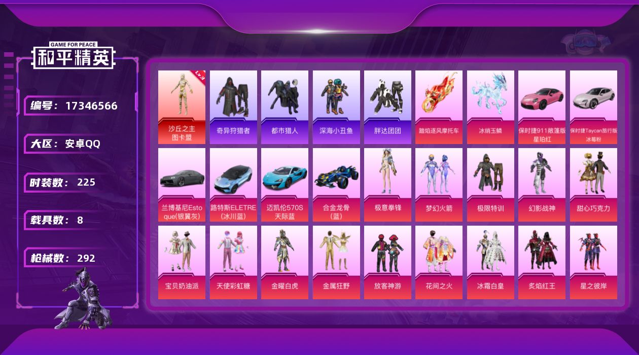 【516318】【不可二次】【安卓QQ】合金龙骨蓝色 紫电风暴 焦糖拿铁 M416-五爪金龙 奇异狩猎者 MG3-洛神天依 甜心巧克力 金属狂野 洛天依 极限特训 兰博轿车灰色 迈凯伦570S 天际蓝 放客神游 梦幻火箭 天使彩虹糖 金耀白虎 深海小丑鱼 宝贝奶油派 幻影战神 紫螳螂