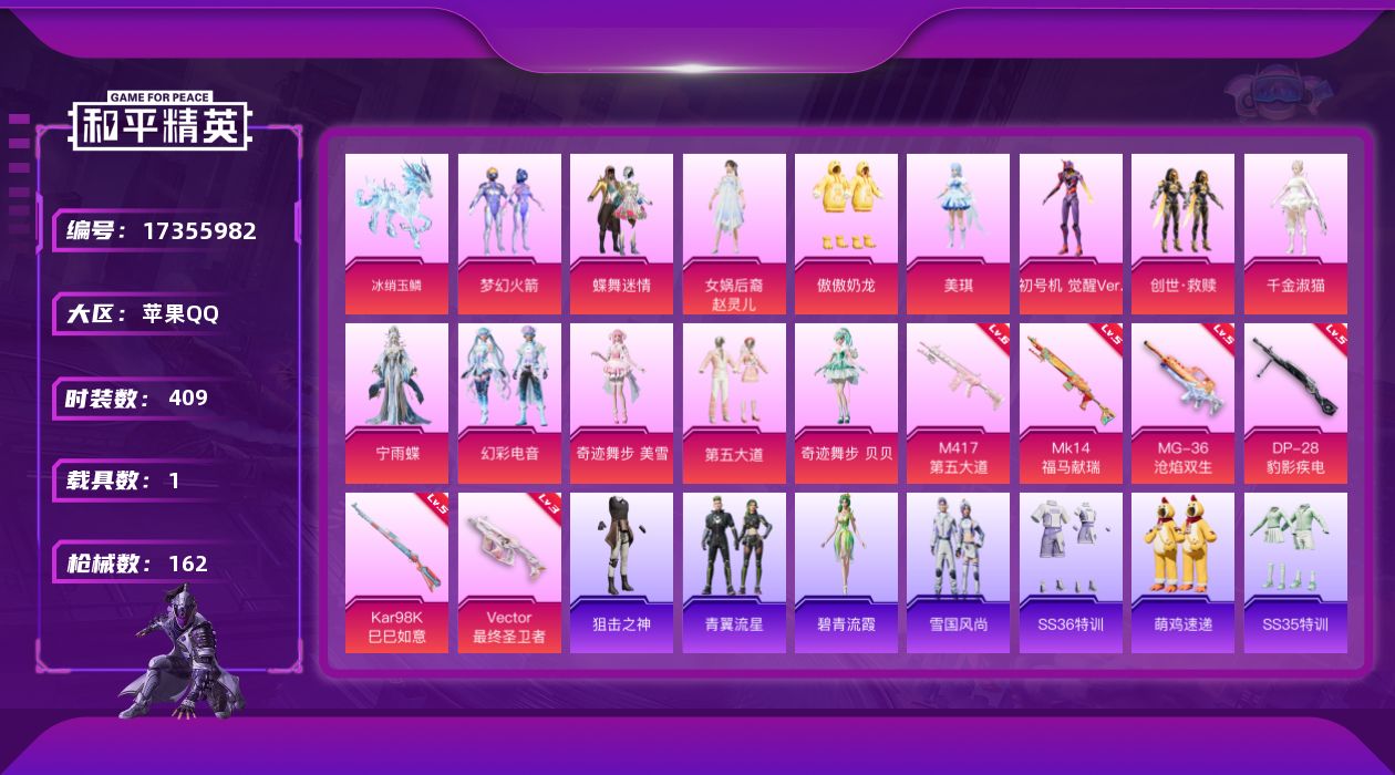 【517867】【可二次】【苹果QQ】梦幻火箭 漫步者 女娲后裔-赵灵儿 金丰海韵降落伞 粉雾星云 蝶舞迷情 M417射手步枪 浪漫天命
