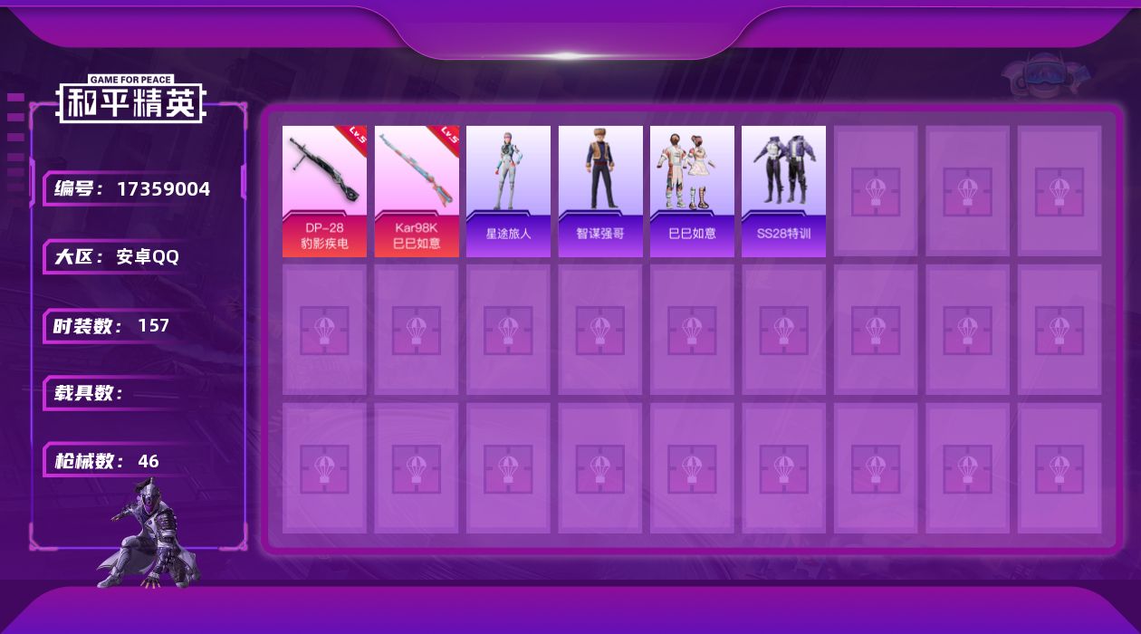 【518739】[17359004]【特价出售】安卓Q-3特效枪34套装46枪皮 12272热力值 历史坚韧铂金Ⅲ 【3特效枪】 Kar98K-巳巳如意 (5级) DP-28-豹影疾电 (5级) Mk14-福马献瑞 (2级)