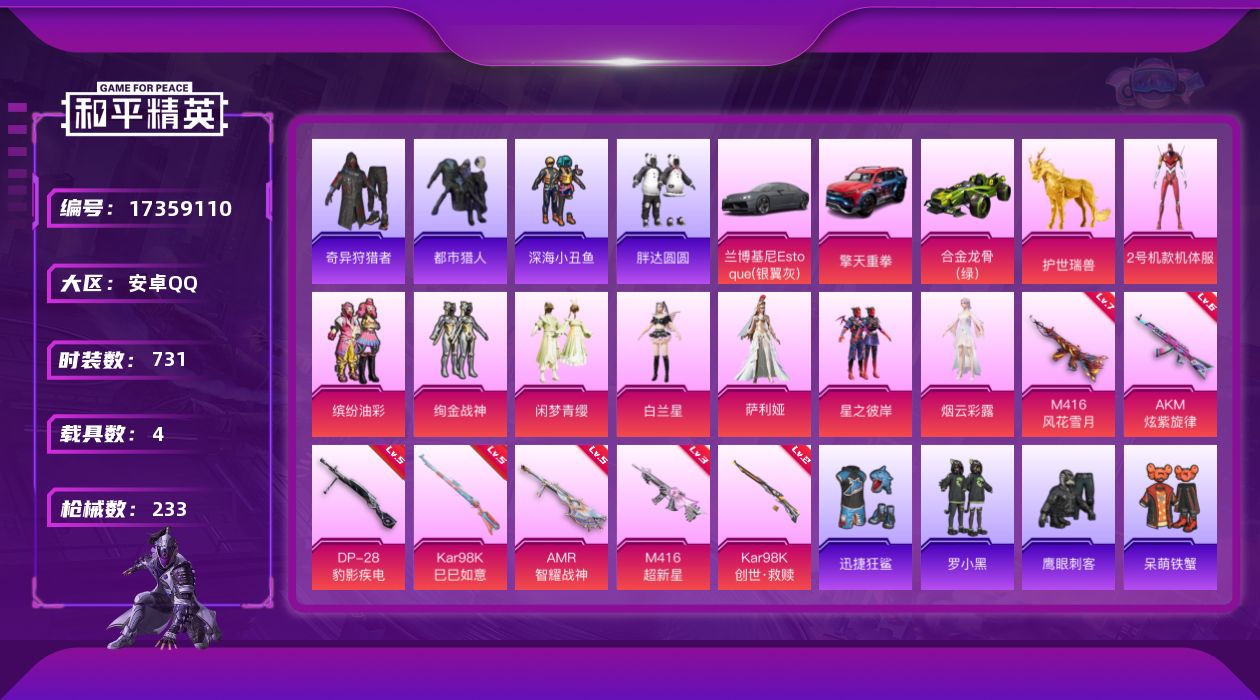 【518769】【可二次】【安卓QQ】龟仙人 S686-奇异狩猎者 漫步者 都市猎人 极速红龙 罗小黑 星之彼岸 恶魔人蛛 M416-仓鼠灰灰 缤纷油彩 深海小丑鱼 瑞龙福将 M416-超新星 浪漫天命 镜光幻境飞行翼 胖达圆圆 团圆交子 AKM-奇异狩猎者 绚金战神 合金龙骨绿色 迅捷狂鲨 奇异狩猎者 M762-瑞龙福将 兰博轿车灰色 狂沙舞者 变形金刚飞行器 AKM-炫紫旋律 M416-风花