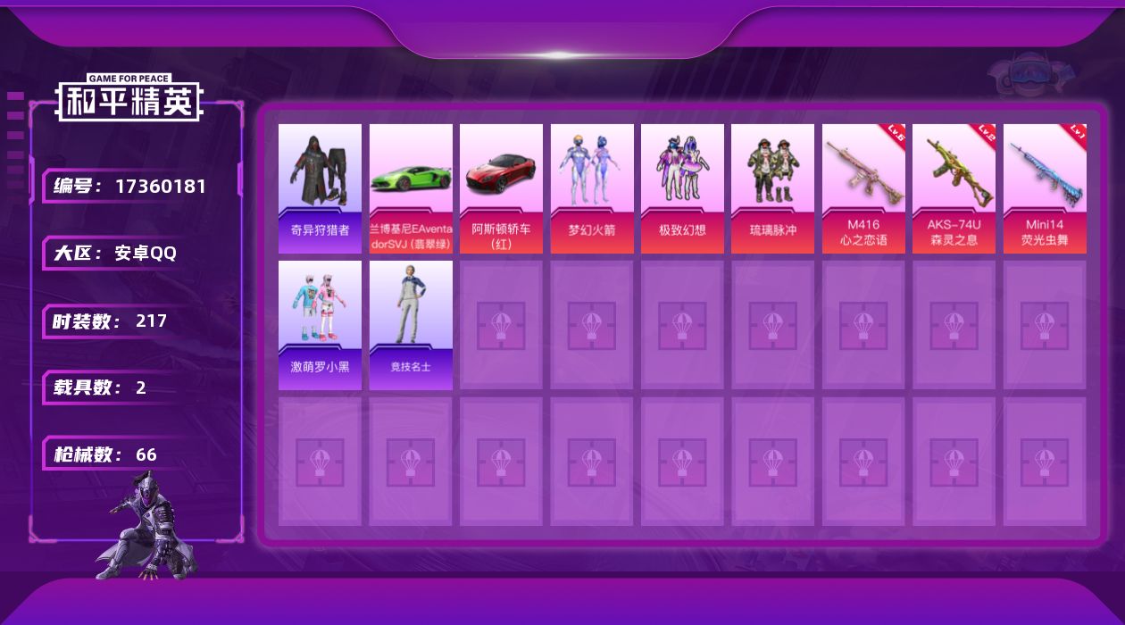 【519051】【不可二次】【安卓QQ】兰博SVJ绿色 S686-奇异狩猎者 迪迦奥特曼 奇异狩猎者 琉璃脉冲 M24-奇异狩猎者 M762-瑞龙福将 极致幻想 M762-奇异狩猎者 梦幻火箭 M416-心之恋语 阿斯顿马丁S红色 Mini14-荧光虫舞 瑞龙福将 梦之呓语 激萌罗小黑 纯白誓言 团圆交子 AKM-奇异狩猎者