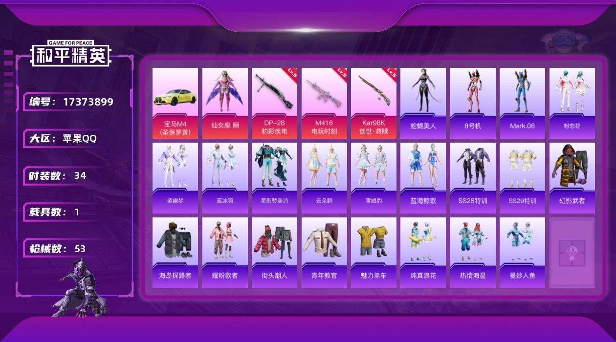 【520375】[17373899]【店主推荐捡漏号!可直接换绑】苹果 手Q-1粉装-3特效枪-1载具-1粉色飞行器-17395热力值-1王牌印记-34套装-53枪皮【热门品类】:角色-8号机,角色-Mark.06【粉色套装】:角色-仙女座 瞬【粉色枪皮等级】:M416-电玩时刻(五级),Kar98K-创世·救赎(五级),DP-28-豹影疾电(五级)【粉色载具】:宝马M4(圣保罗黄)【粉色枪皮】