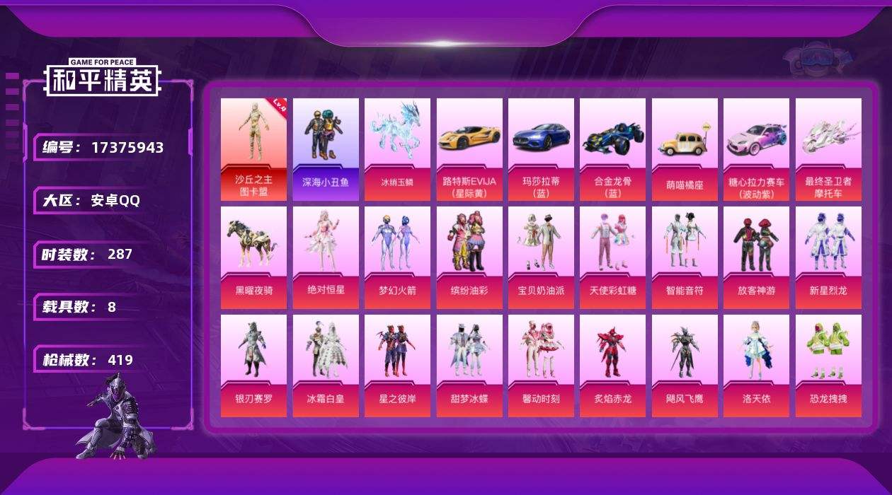 【520617】【不可二次】【安卓QQ】合金龙骨蓝色 恐龙拽拽 M416-五爪金龙 路特斯EV黄色 新星烈龙 洛天依 M417射手步枪 萌喵橘座 玛莎拉蒂蓝色 放客神游 梦幻火箭 银刃赛罗 AKM-梦之光华 天使彩虹糖 缤纷油彩 深海小丑鱼 浪漫波比 宝贝奶油派 馨动时刻 SCAR-童趣迷兔 智能音符 AUG-星之彼岸 爆炸猎弓 甜梦冰蝶