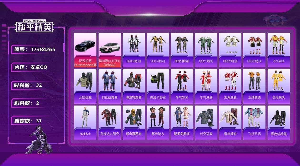 【521459】[17384265]安卓 手Q-0粉装-0特效枪-2载具-0粉色飞行器-11101热力值-3王牌印记-32套装-31枪皮【粉色载具】:路特斯ELETRE(花绽灰),玛莎拉蒂Quattroporte(夜幕蓝)【稀有枪皮】:AKM-彩虹符号,AKM-破晓战魂,M16A4-甜心亚梦,SCAR-L-玉兔迎春,M416-蓝色火焰,GROZA-恐龙拽拽,AUG-耀粉歌者,QBZ-飞驰魅影,A