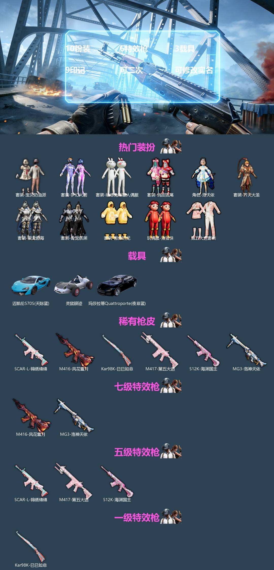 【521872】【可二次】【苹果QQ】龟仙人 梦幻火箭降落伞 灵鼠银迹 洛天依 暗夜鎏金降落伞 第五大道降落伞 瑞龙福将 环太平洋降落伞 浪漫天命 蜜语绒猫降落伞 骨龙祭渊 梦幻火箭飞行器 旋转彩虹降落伞 猪猪侠 未来战士降落伞 团圆交子 红熊茄茄 S12K-海渊国主 暗夜契约 MG3-洛神天依 M417射手步枪 迈凯伦570S 天际蓝 银龙傲海 齐天大圣 M416-风花雪月 梦幻火箭 狂战萌兔
