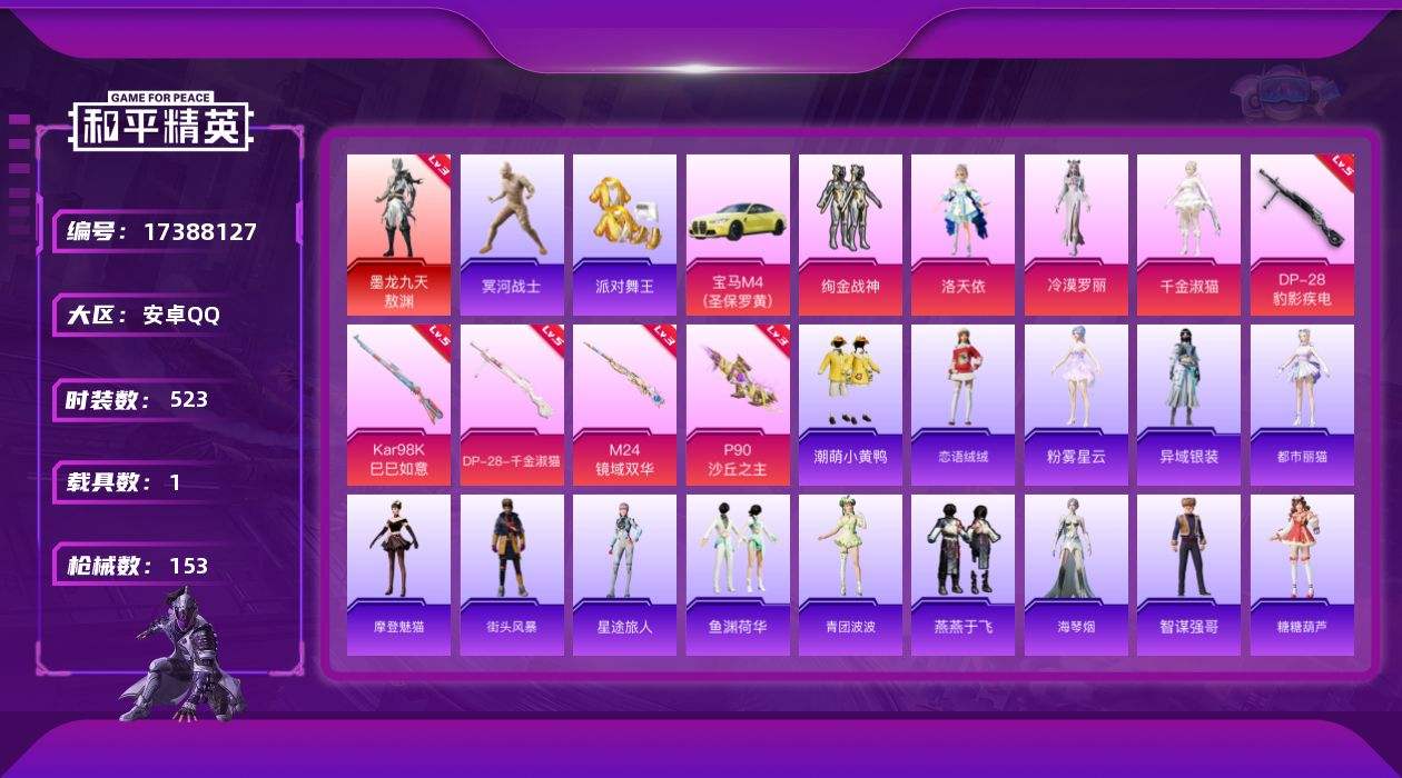 【522147】【不可二次】【安卓QQ】木乃伊 M24-镜域双华 绚金战神 P90-沙丘之主 墨龙九天-敖渊 潮萌小黄鸭 激萌小黄鸭 派对舞王 洛天依 极速红龙 龙翔九天飞行器