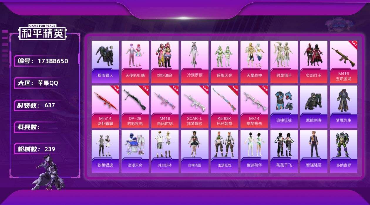【522394】【不可二次】【苹果QQ】软萌银虎 龟仙人 S686-奇异狩猎者 M416-五爪金龙 漫步者 都市猎人 迅捷狂鲨 暗夜契约 炙焰红王 M762-奇异狩猎者 M416-电玩时刻 太空嘟嘟飞行器 Mini14-龙虾霸霸 天使彩虹糖 缤纷油彩 碧影闪光 SCAR-L-纯梦嫁纱 浪漫天命 纯白誓言