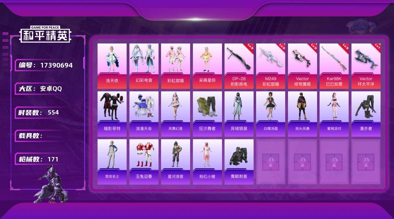 【522951】【不可二次】【安卓QQ】漫步者 M762-瑞龙福将 齐天大圣飞行器 Vector-环太平洋 洛天依 狂沙舞者 极速红龙 M762-奇异狩猎者 M249-彩虹甜喵 AKM-缤纷海域 粉红小猪 M24-香水柠檬 瑞龙福将 浪漫天命 暗影哥特 星河浪客 团圆交子