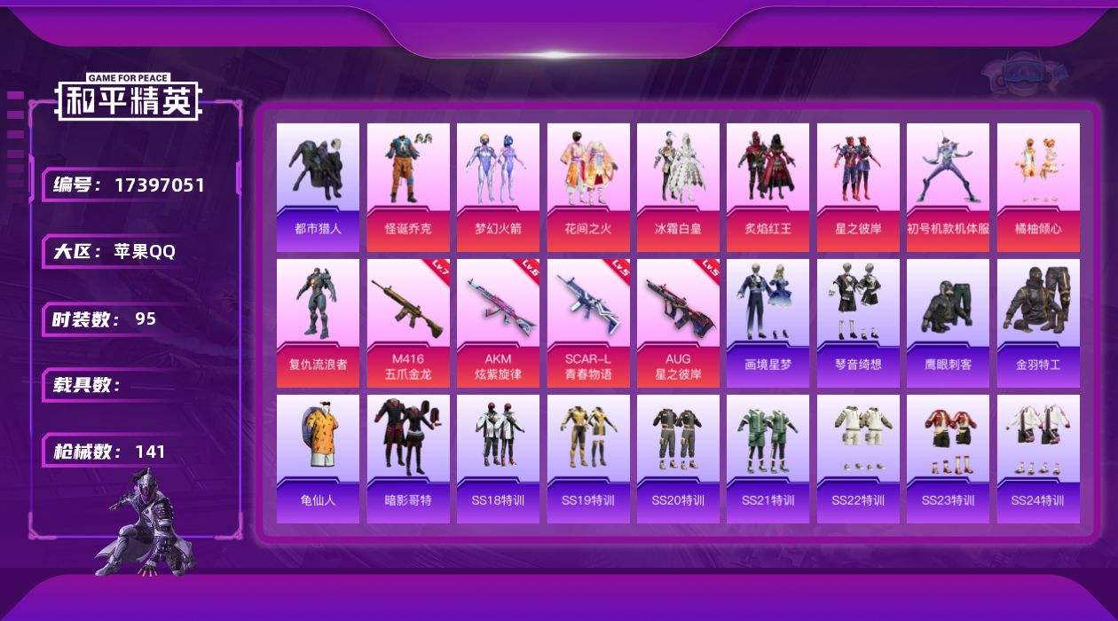 【523514】【可二次】【苹果QQ】AKM-炫紫旋律 梦幻火箭 M416-五爪金龙 怪诞乔克 紫螳螂 AUG-星之彼岸 SCAR-L-青春物语