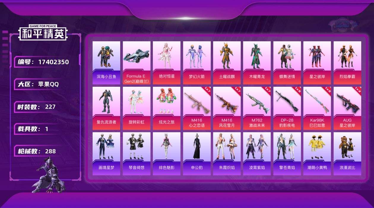 【524232】【可二次】【苹果QQ】VSS-烈焰拳霸 M762-激战未来 木耀青龙 土耀战麟 Formula E Gen2(兰) M416-风花雪月 梦幻火箭 M416-心之恋语 深海小丑鱼 浪漫波比 激萌小黄鸭 蝶舞迷情 AUG-星之彼岸