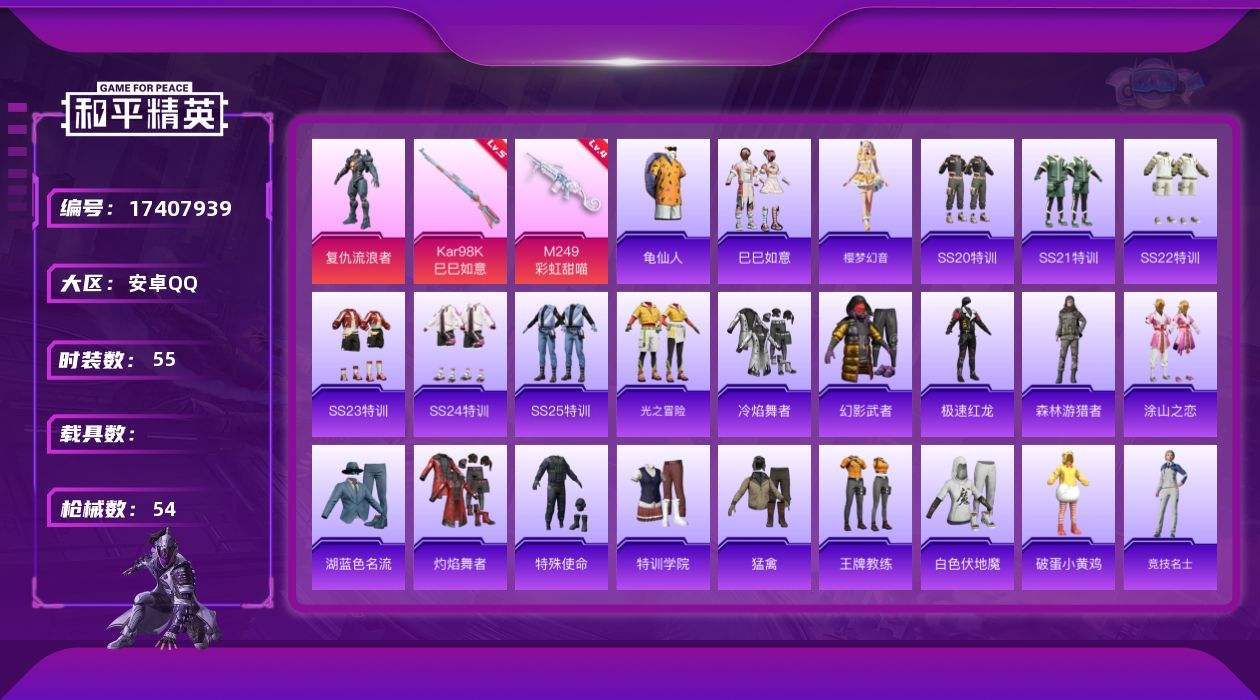 【525117】[17407939]【FK6472】55套装/枪械3/装备51/战备44/热力值16380/五级Kar98K-巳巳如意/四级Mk14-福马献瑞/四级M249-彩虹甜喵/龟仙人/复仇流浪者/Kar98K-巳巳如意/Mk14-福马献瑞/M249彩虹甜喵/星之彼岸降落伞/彩虹甜喵降落伞/炫光之旅降落伞/巳巳如意/樱梦幻音/AKM-彩虹符号/AKM-恐龙拽拽/AKM-龙的传人/SCAR-