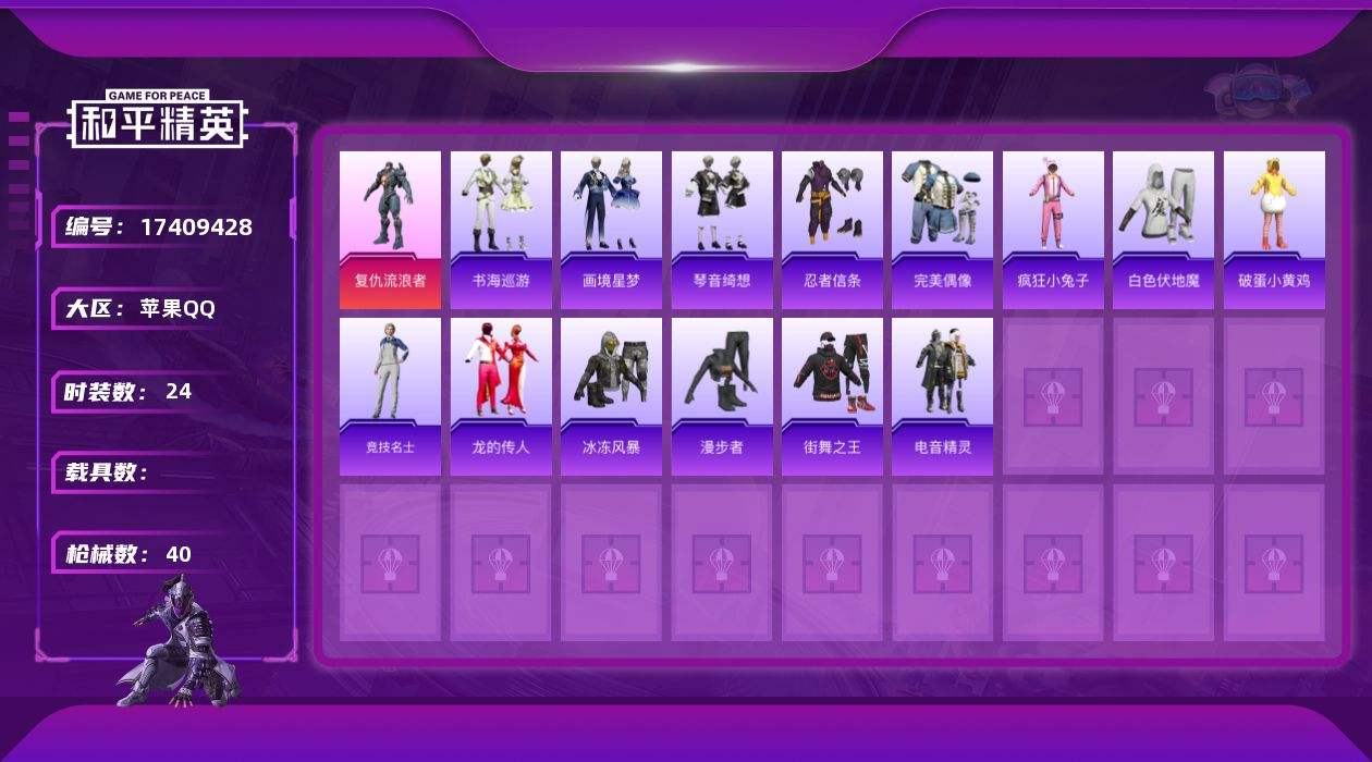 【525458】[17409428]【FK6475】24套装/枪械2/装备35/战备28/王牌印记2/热力值8623/五级UMP45-萌骑冒险/四级Mk14-福马献瑞/忍者信条/复仇流浪者/UMP45-萌骑冒险/Mk14-福马献瑞/罪夜之冕降落伞/套装-马上有钱/书海巡游/画境星梦/琴音绮想/套装-雨过天青/套装-红釉青花/AKM-龙的传人/SCAR-L-夜灯/M416-红色方程式/GROZA-