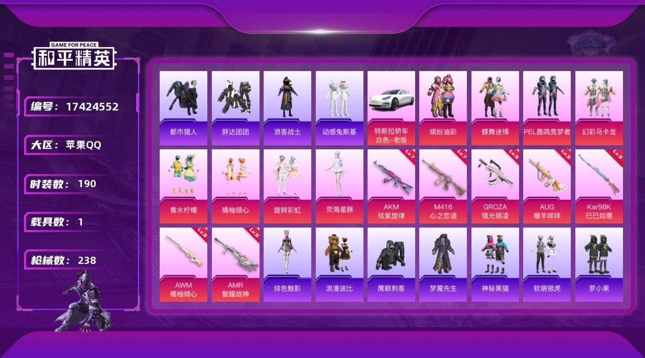 【527992】【不可二次】【苹果QQ】AKM-炫紫旋律 幻彩马卡龙 M416-心之恋语 缤纷油彩 PEL轰鸣竞梦者 特斯拉3银色 浪漫波比 蝶舞迷情 AWM-橘柚倾心