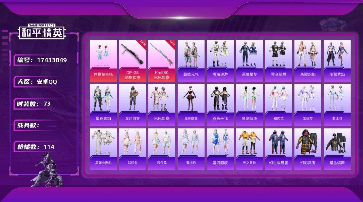 【529081】[17433849]安卓 手Q-2粉装-5特效枪-0载具-2粉色飞行器-31203热力值-3王牌印记-73套装-114枪皮【热门品类】:套装-星河浪客【粉色套装】:粉装-仲夏莫吉托,角色-霁蓝缠春【粉色枪皮等级】:ACE32-萌骑漫游(五级),Kar98K-巳巳如意(五级),Mk14-福马献瑞(五级),AA12-G-萌骑幻想(五级),DP-28-豹影疾电(五级)【粉色枪皮】:AC