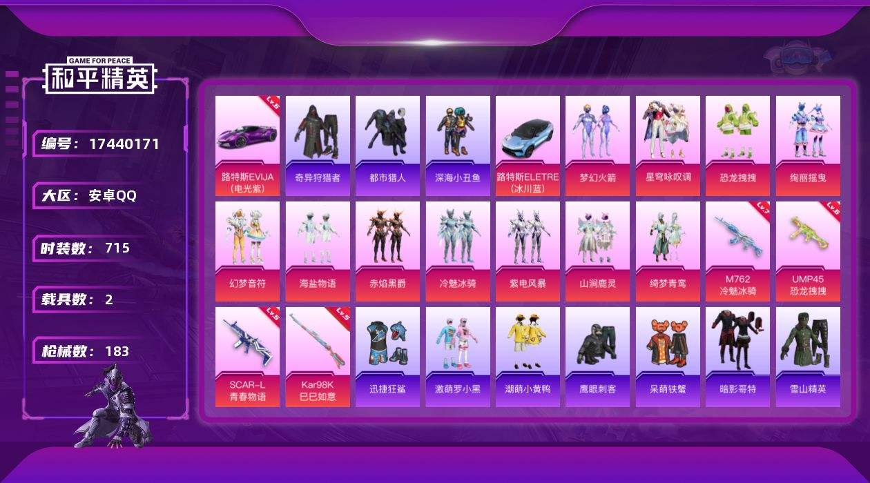 【530074】【可二次】【安卓QQ】路特斯EV紫色 龟仙人 恐龙拽拽 漫步者 萌兔起飞 都市猎人 机械英豪 极速红龙 UMP45-恐龙拽拽 豚鼠丹丹 绮梦青鸾飞行器 梦起落英 赤焰黑爵 海盐物语 MK47-林间仙鹿 深海小丑鱼 山涧鹿灵 激萌小黄鸭 激萌罗小黑 AKM-奇异狩猎者 紫电风暴 迅捷狂鲨 奇异狩猎者 冷魅冰骑飞行器 潮萌小黄鸭 黑色刀锋 绮梦青鸾 狂沙舞者 白月香洋装 梦幻火箭 A