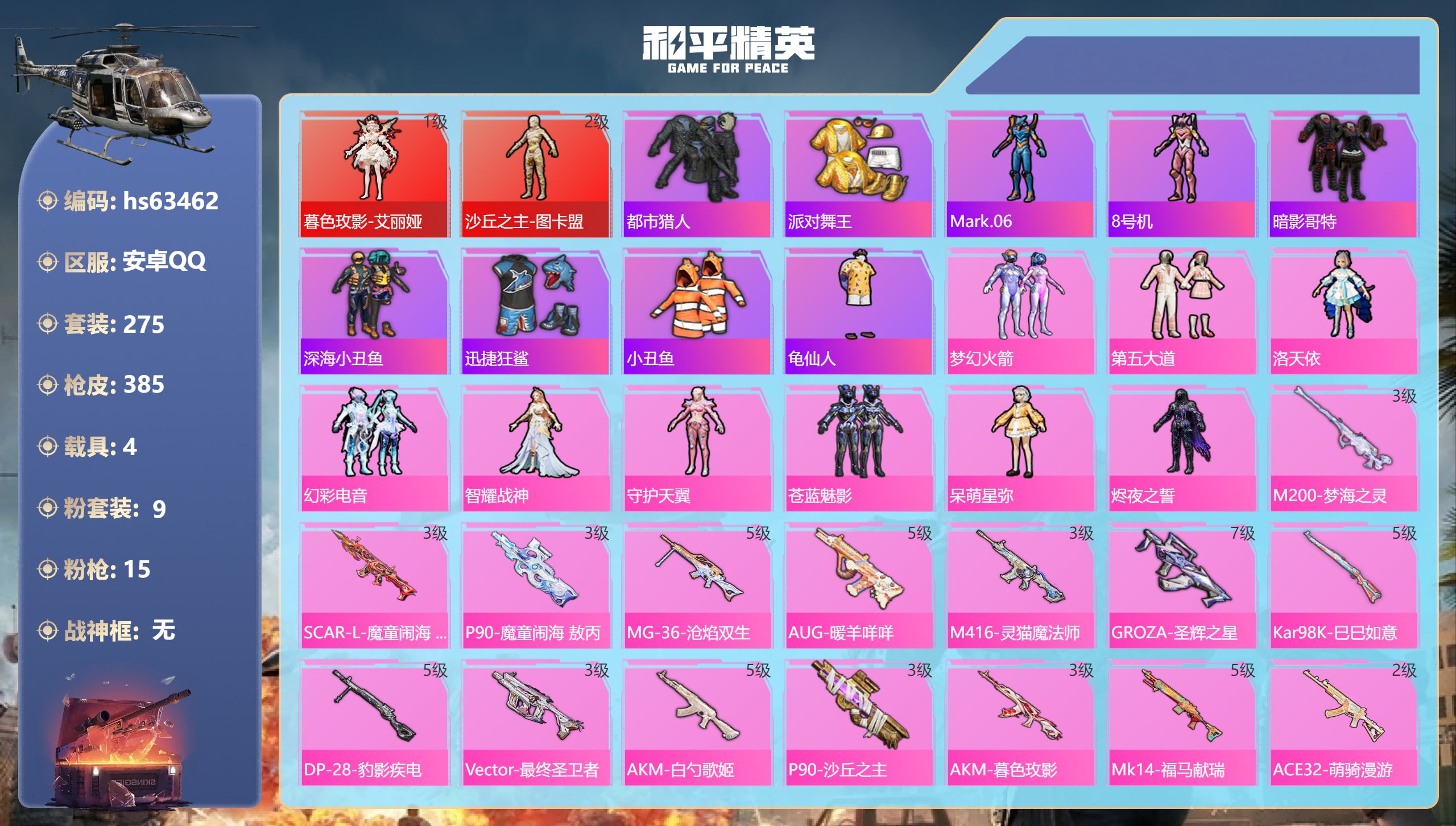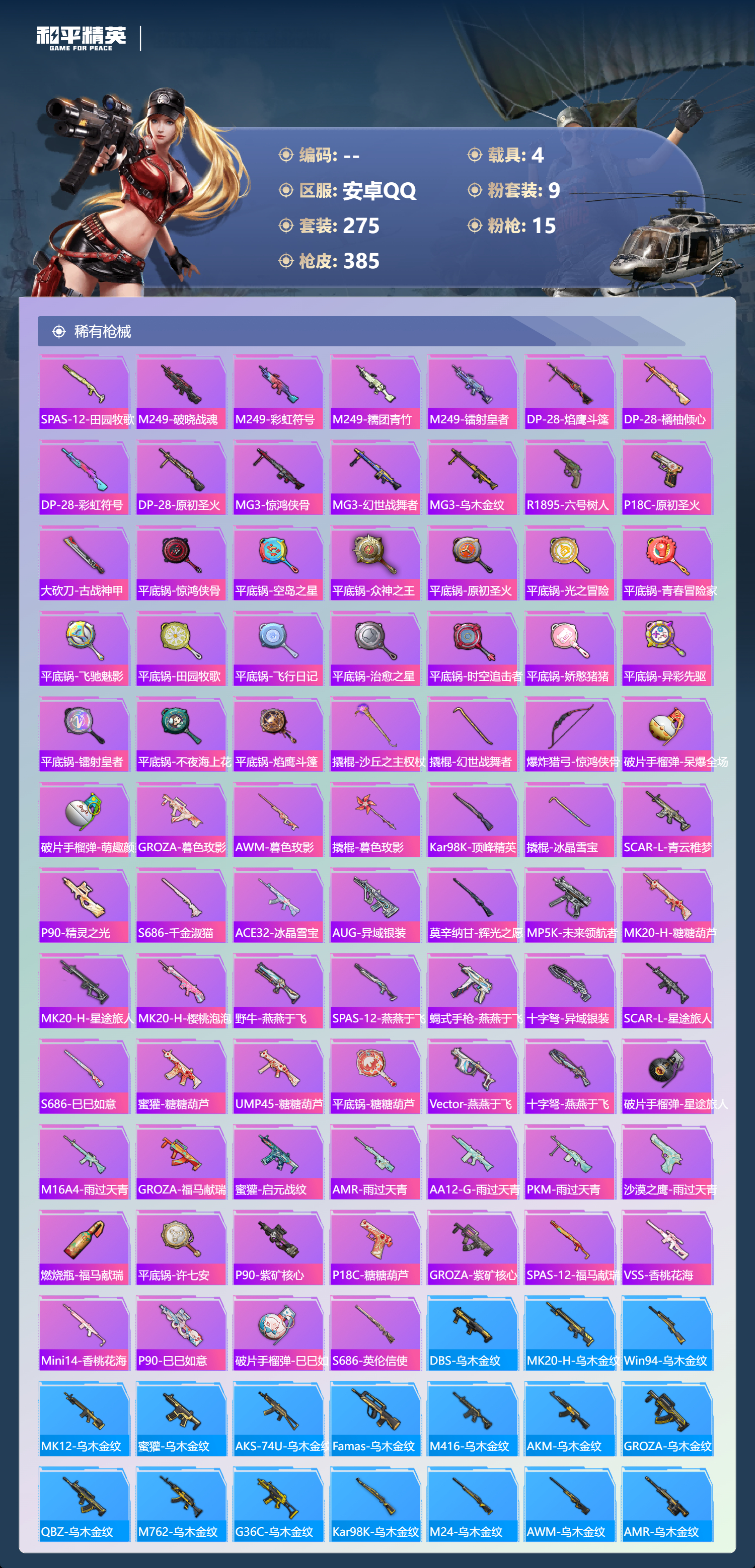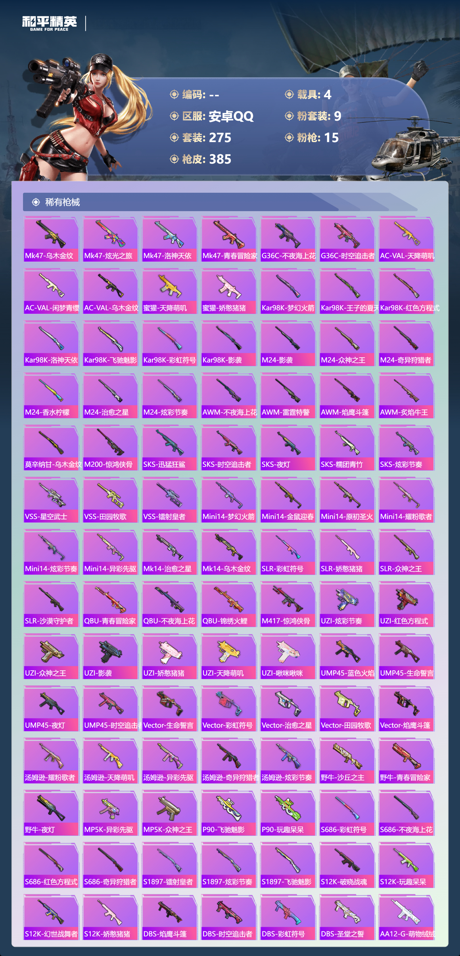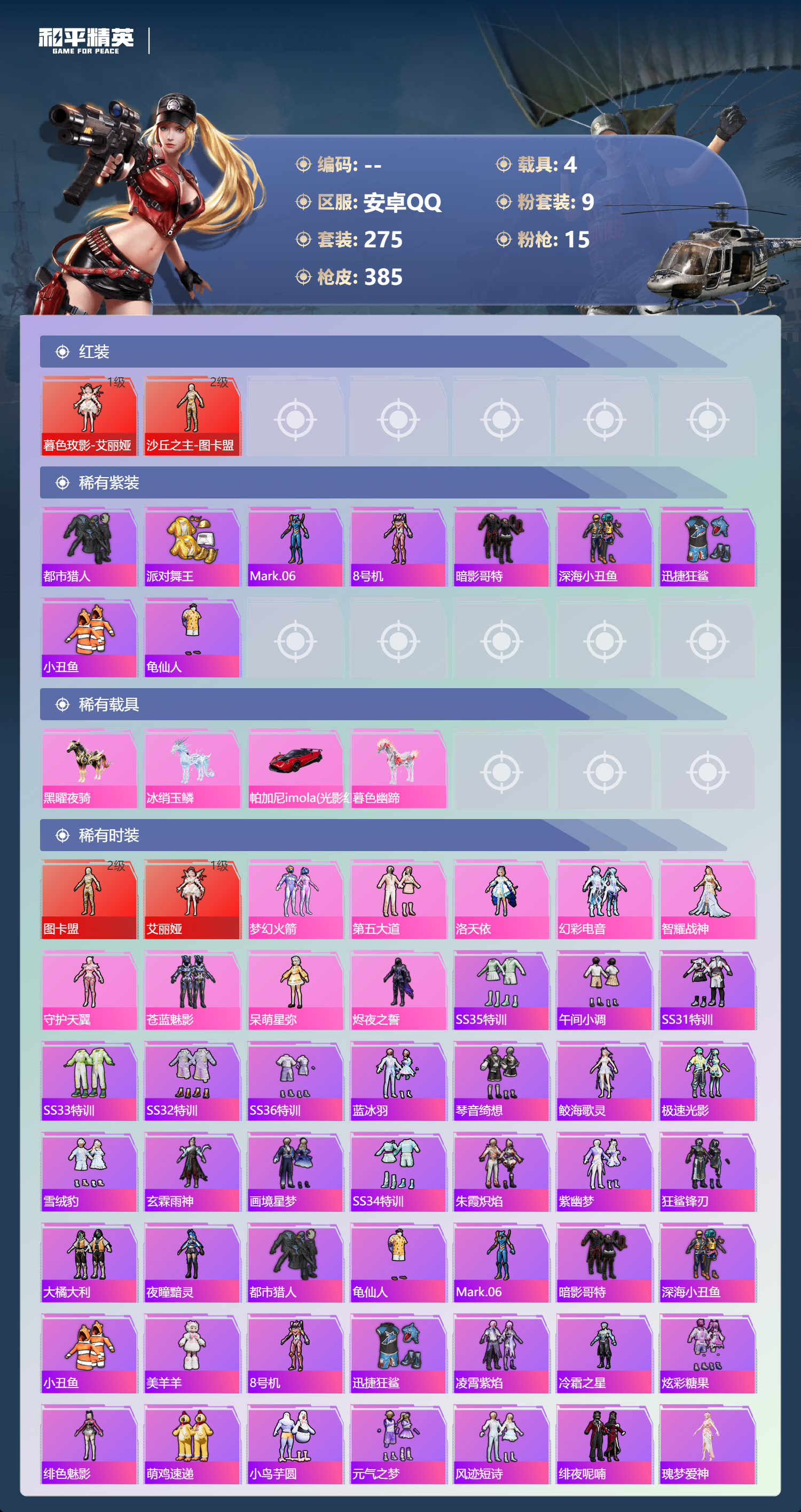 【530791】【不可二次】【安卓QQ】龟仙人 S686-奇异狩猎者 漫步者 P90-沙丘之主 都市猎人 苍蓝魅影 M24-奇异狩猎者 AKM-白勺歌姬 洛天依 极速红龙 M762-奇异狩猎者 沙丘之主-图卡盟 浪漫假日 深海小丑鱼 M24-香水柠檬 抹茶蜜豆 软软马卡龙 激萌罗小黑 AKM-奇异狩猎者 迅捷狂鲨 萌物绒绒飞行器 白月香洋装 梦幻火箭 幻海精灵飞行器 AKM-缤纷海域 粉红小猪