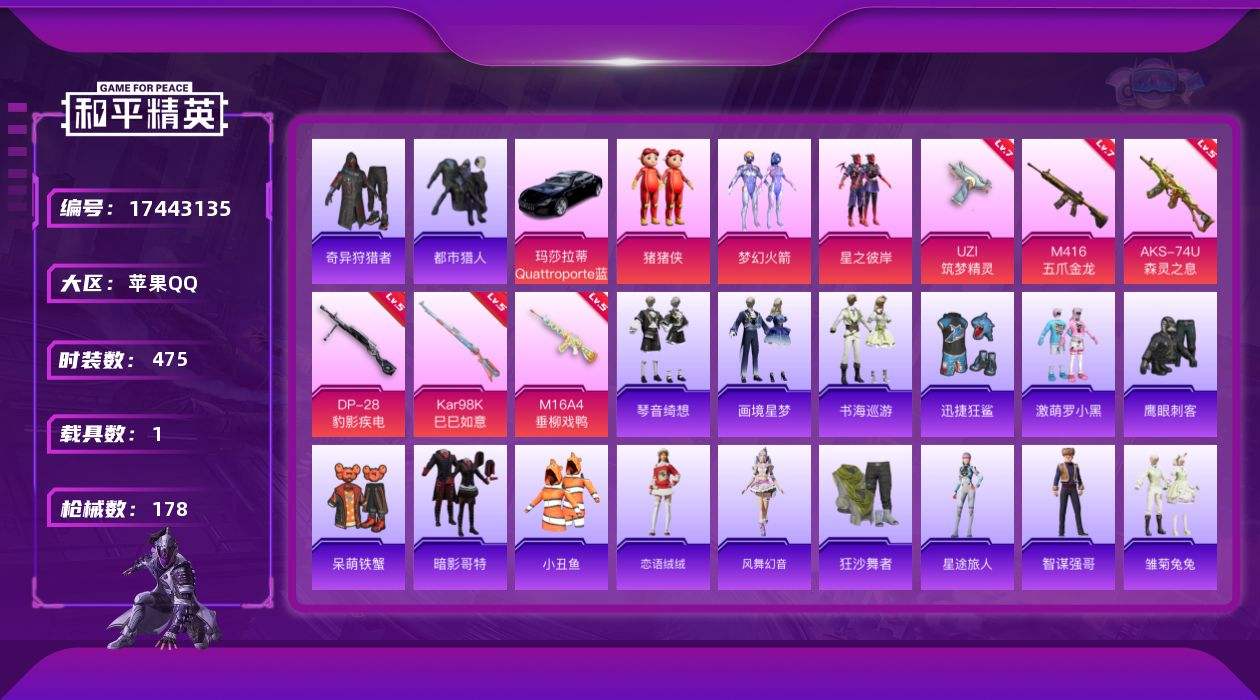 【530936】【可二次】【苹果QQ】M16A4-垂柳戏鸭 S686-奇异狩猎者 M416-五爪金龙 漫步者 都市猎人 迅捷狂鲨 奇异狩猎者 M24-奇异狩猎者 狂沙舞者 M762-奇异狩猎者 梦幻火箭 星之彼岸 AKM-缤纷海域 暗影哥特 猪猪侠 激萌罗小黑 AKM-奇异狩猎者