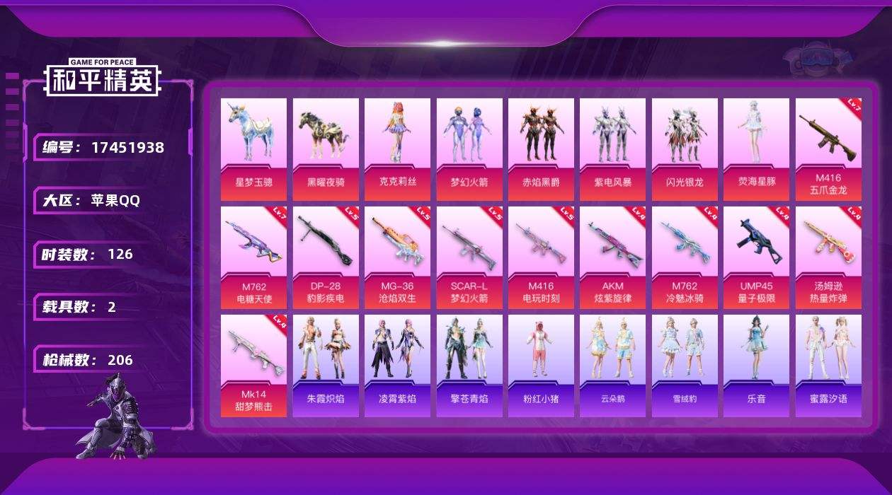 【531939】【可二次】【苹果QQ】紫电风暴 AKM-炫紫旋律 赤焰黑爵 梦幻火箭 M416-五爪金龙 SCAR-L梦幻火箭