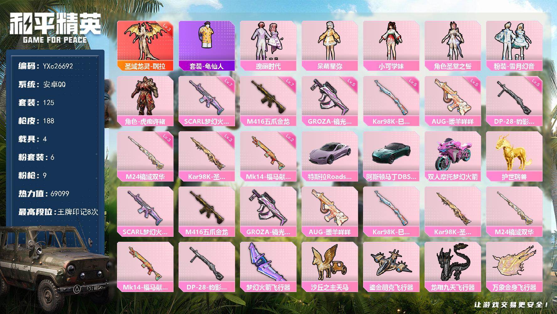 【532740】【可二次】【安卓QQ】龟仙人 双人摩托梦幻火箭 梦幻火箭降落伞 春暖花开降落伞 M416-五爪金龙 暗翼战神降落伞 洛神天依降落伞 浪漫樱花 阿斯顿马丁S绿色 赛博空间 M24-香水柠檬 瑞龙福将 甜蜜誓约降落伞 梦幻火箭飞行器 纯白誓言 团圆交子 SCAR-L-梦幻火箭 暗夜契约 M762-瑞龙福将 黑色刀锋 特斯拉R沁心粉 彩虹甜喵降落伞 圣域龙灵-瑞拉 M416-魔法学院