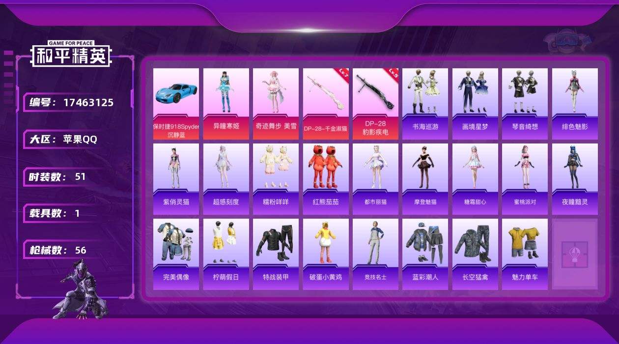 【533289】[17463125]苹果 手Q-4粉装-3特效枪-1载具-1粉色飞行器-21673热力值-3王牌印记-51套装-56枪皮【热门品类】:套装-糯粉咩咩,套装-红熊茄茄【粉色套装】:角色-奇迹舞步 美雪,角色-异瞳寒姬,角色-霁蓝缠春,角色-辉云木星【粉色枪皮等级】:Mk14-福马献瑞(五级),DP-28-千金淑猫(七级),DP-28-豹影疾电(五级)【粉色载具】:保时捷918 Sp