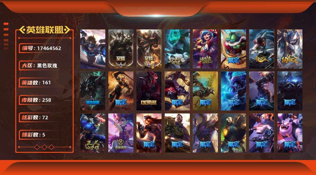 【533486】[17464562]【特价出售/店主推荐】未定级段位-161英雄-258皮肤-72炫彩-1终极-4神话-37限定-35传说-67史诗 【至臻皮肤】:至臻王国机神玄武盖伦,至臻腥红之月亚托克斯 【臻彩皮肤】:古琴余韵娑娜炫金天籁,冰霜之刃艾瑞莉娅炫金,冠军之隐劫凯旋圣装,霸天巨兽雪崩墨菲特,红莲之刃锐雯 【年限皮肤】:银龙裁决泰隆,王国机神苍狼瑟提 【冰雪限定】:圣诞狂欢努努和威朗