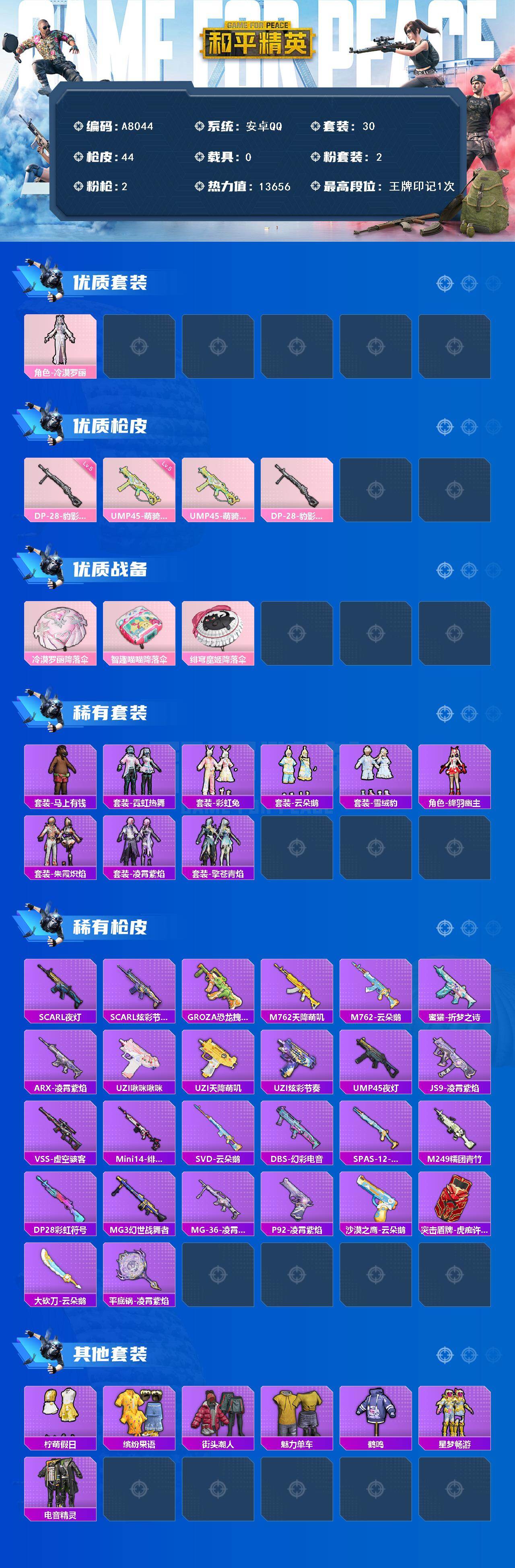 【536341】【A8044】安卓【小号 角色-冷漠罗丽,UMP45-萌骑冒险(五级),DP-28-豹影疾电(五级)】 手Q-2粉装-2特效枪-0载具-0粉色飞行器-13656热力值-1王牌印记-30套装-44枪皮 【粉色套装】:角色-冷漠罗丽 【粉色枪皮等级】:UMP45-萌骑冒险(五级),DP-28-豹影疾电(五级) 【粉色枪皮】:UMP45-萌骑冒险,DP-28-豹影疾电 【粉色降落伞】: