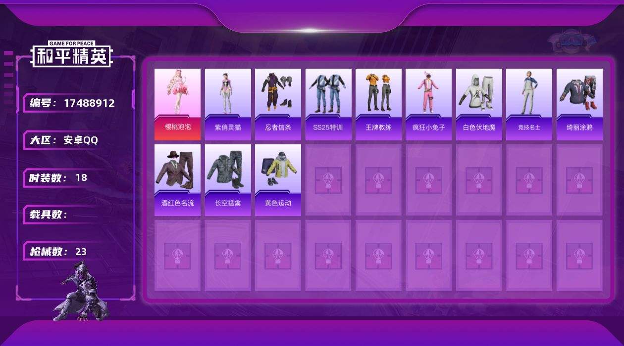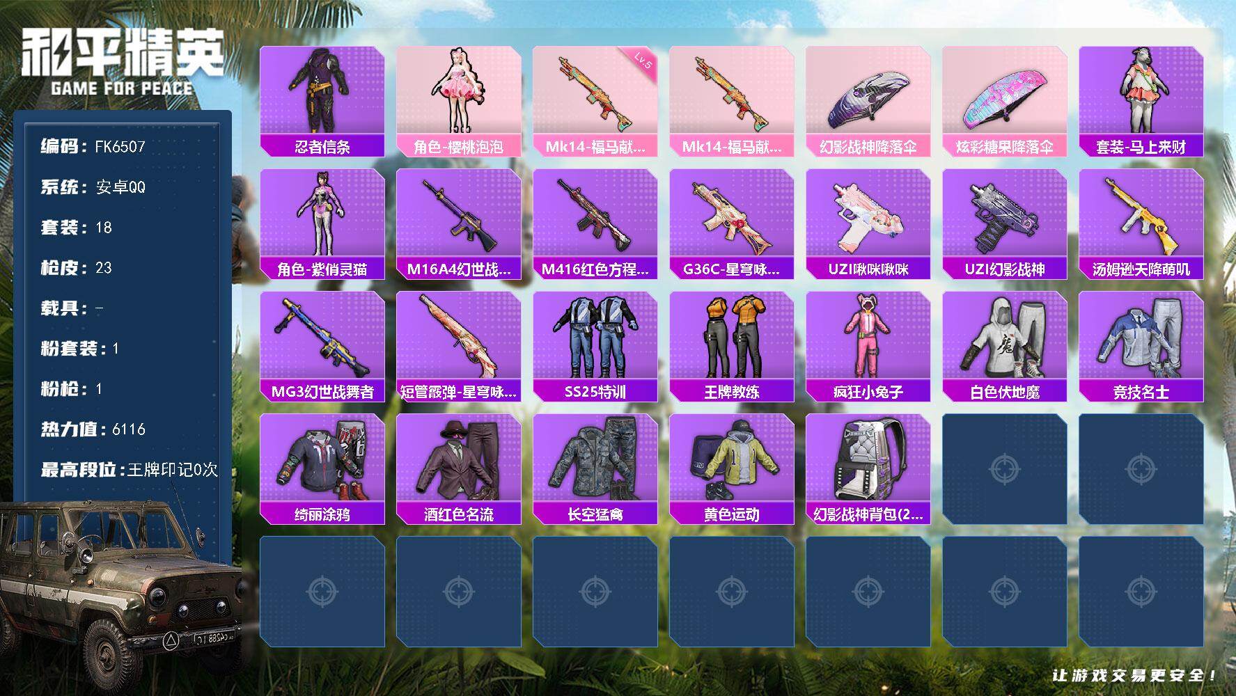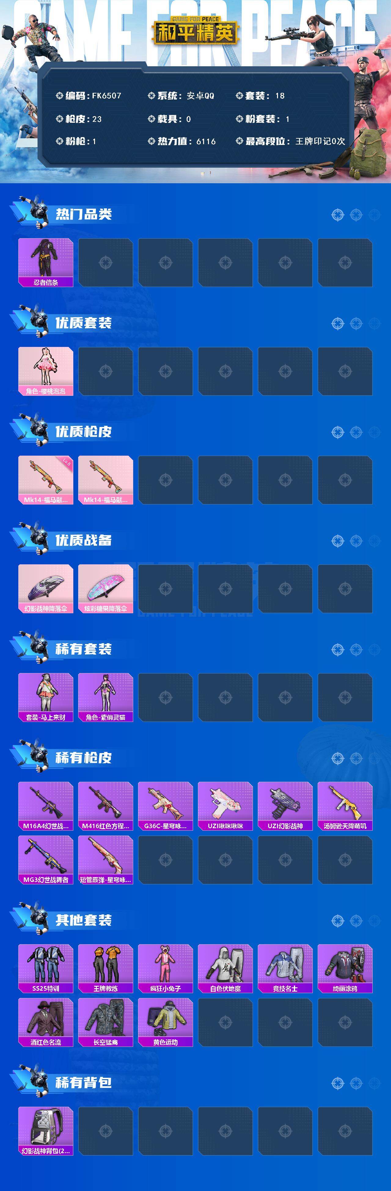 【536926】[17488912]【FK6507】18套装/枪械1/装备30/战备18/热力值6116/五级Mk14-福马献瑞/忍者信条/樱桃泡泡/Mk14-福马献瑞/幻影战神降落伞/炫彩糖果降落伞/套装-马上来财/紫俏灵猫/M16A4-幻世战舞者/M416-红色方程式/G36C-星穹咏叹调/UZI-啾咪啾咪/UZI-幻影战神/汤姆逊-天降萌叽/MG3-幻世战舞者/短管霰弹-星穹咏叹调/SS2