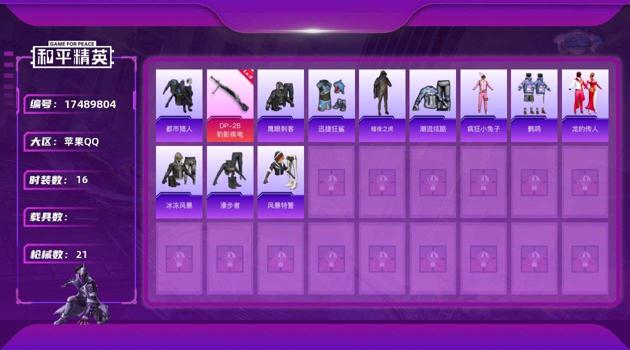 【537017】[17489804]【FK6517】16套装/枪械1/装备11/战备18/热力值4908/三级DP-28-豹影疾电/都市猎人/暗夜之虎/DP-28-豹影疾电/角色-幸运青/套装-雨过天青/套装-红釉青花/AKM-影袭/M416-糯团青竹/GROZA-影袭/M762-甜心宝贝/蜜獾-天降萌叽/UZI-影袭/汤姆逊-像素花束/Kar98K-影袭/M24-影袭/Mini14-梦幻火箭/
