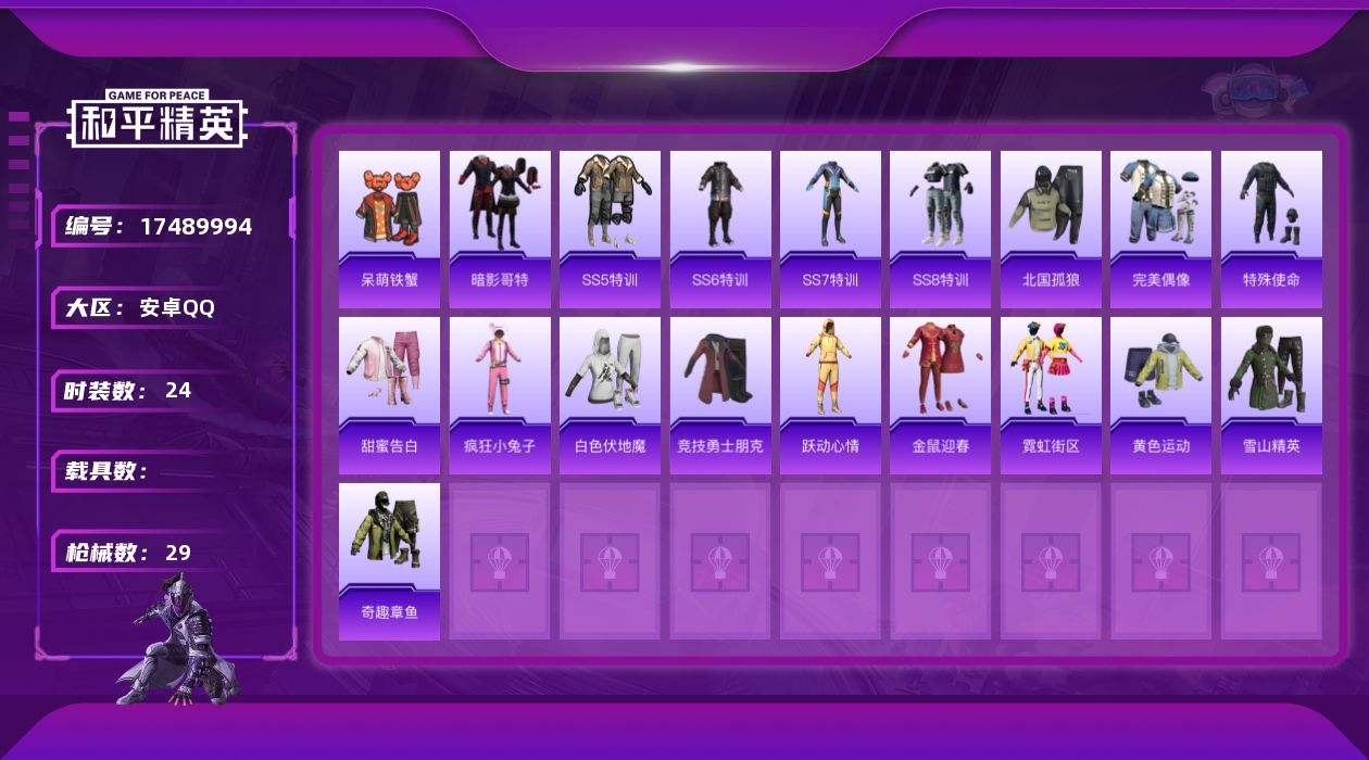 【537043】[17489994]【FK6518】24套装/枪械1/装备26/战备37/热力值6763/四级ACE32-萌骑漫游/暗影哥特/ACE32-萌骑漫游/套装-雨过天青/套装-红釉青花/AKM-缤纷海域/AKM-霓虹街区/M16A4-生命誓言/M416-蓝色火焰/AUG-耀粉歌者/UZI-生命誓言/UMP45-蓝色火焰/Vector-生命誓言/汤姆逊-像素花束/Kar98K-红色方程式