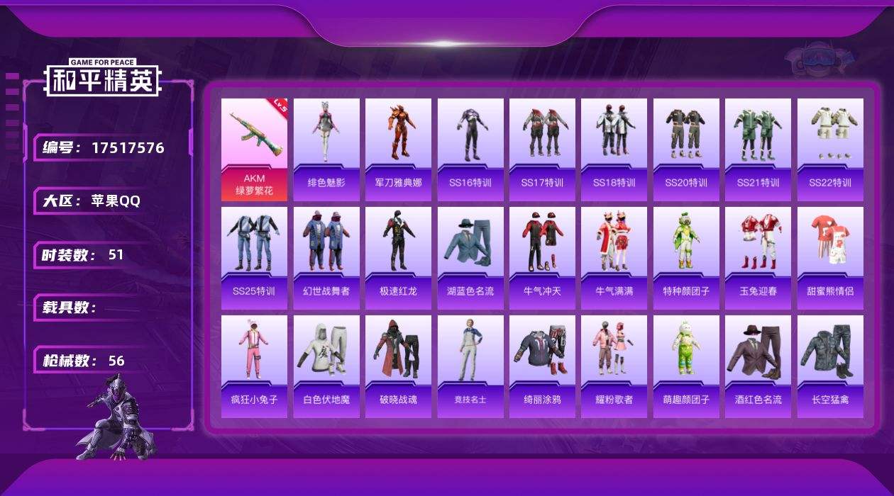 【540603】[17517576]【FK6533】51套装/枪械1/装备53/战备47/王牌印记2/热力值17340/五级AKM-绿萝繁花/军刀雅典娜/AKM绿萝繁花/蓝莓炮弹降落伞/环太平洋降落伞/闲梦青缨降落伞/炫彩糖果降落伞/绯色魅影/AKM-海渊国主/AKM-萌趣颜团子/AKM-龙的传人/M16A4-幻世战舞者/M16A4-甜心亚梦/SCAR-L-玉兔迎春/SCAR-L-红色方程式/M