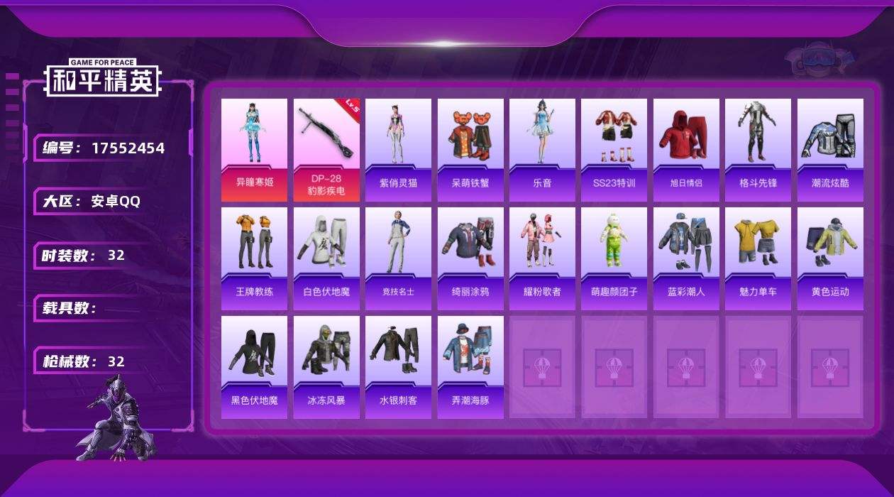 【545116】[17552454]【FK6431】32套装/枪械1/装备50/战备34/王牌印记1/热力值10636/五级DP-28-豹影疾电/异瞳寒姬/DP-28-豹影疾电/炫彩糖果飞行器/冷漠罗丽降落伞/智趣喵喵降落伞/喜羊羊与灰太狼降落伞/炫彩糖果降落伞/炫彩糖果/套装-马上有钱/乐音/紫俏灵猫/角色-孙斩天/AKM-萌趣颜团子/SCAR-L-未来战士/M416-糯团青竹/M762-天降