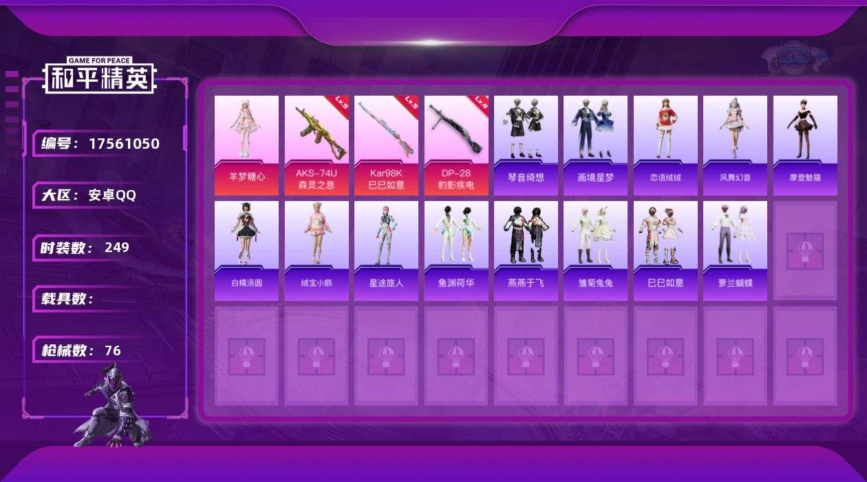【546095】[17561050]【特价出售】钱包不能注销安卓Q-1粉装4特效枪1热门64套装76枪皮 19596热力值 历史不朽星钻Ⅲ 【1粉装】 羊梦糖心 【4特效枪】 AKS-74U-森灵之息 (5级) Kar98K-巳巳如意 (5级) DP-28-豹影疾电 (4级) ACE32-萌骑漫游 (4级) 【1热门】 破蛋小黄鸡