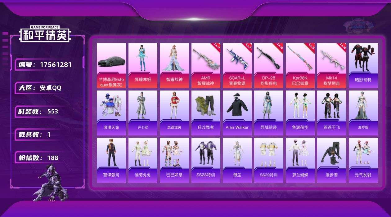 【546174】【可二次】【安卓QQ】水银刺客 漫步者 M762-瑞龙福将 兰博轿车灰色 狂沙舞者 M762-风花雪月 萌熊伴侣 瑞龙福将 M416-黄金龙骨 浪漫天命 SCAR-L-青春物语 暗影哥特 AWM-黄金龙骨 激萌罗小黑 团圆交子