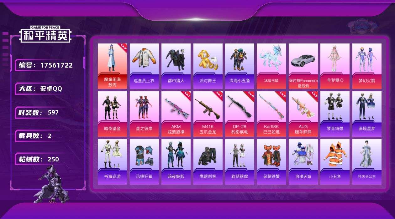 【546294】【可二次】【安卓QQ】软萌银虎 龟仙人 魔童闹海-敖丙 M416-五爪金龙 漫步者 都市猎人 迅捷狂鲨 M762-瑞龙福将 狂沙舞者 AKM-炫紫旋律 巡查衣 梦幻火箭 星之彼岸 AKM-缤纷海域 粉红小猪 深海小丑鱼 瑞龙福将 派对舞王 浪漫天命 梦幻火箭飞行器 团圆交子