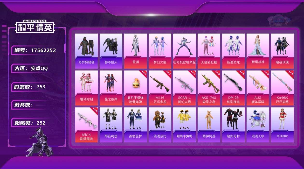 【546410】【不可二次】【安卓QQ】龟仙人 S686-奇异狩猎者 M416-五爪金龙 漫步者 都市猎人 新星烈龙 M24-奇异狩猎者 机械英豪 极速红龙 豚鼠丹丹 忍者信条 M762-奇异狩猎者 娴静芝兰 星之彼岸 M416-仓鼠灰灰 浪漫波比 M24-香水柠檬 馨动时刻 瑞龙福将 激萌小黄鸭 醒狮腾龙 浪漫天命 梦幻火箭飞行器 纯白誓言 团圆交子 AKM-奇异狩猎者 SCAR-L-梦幻火箭
