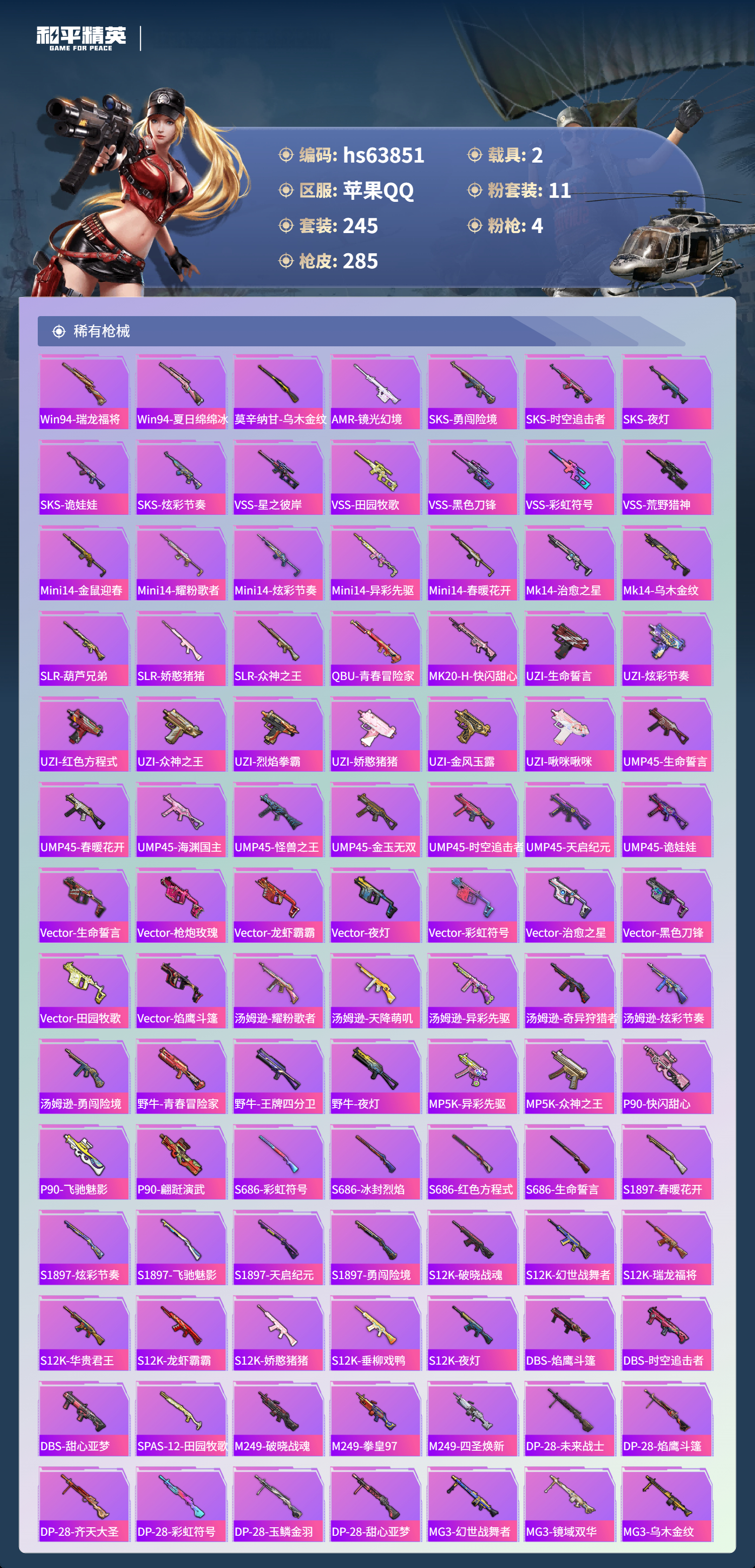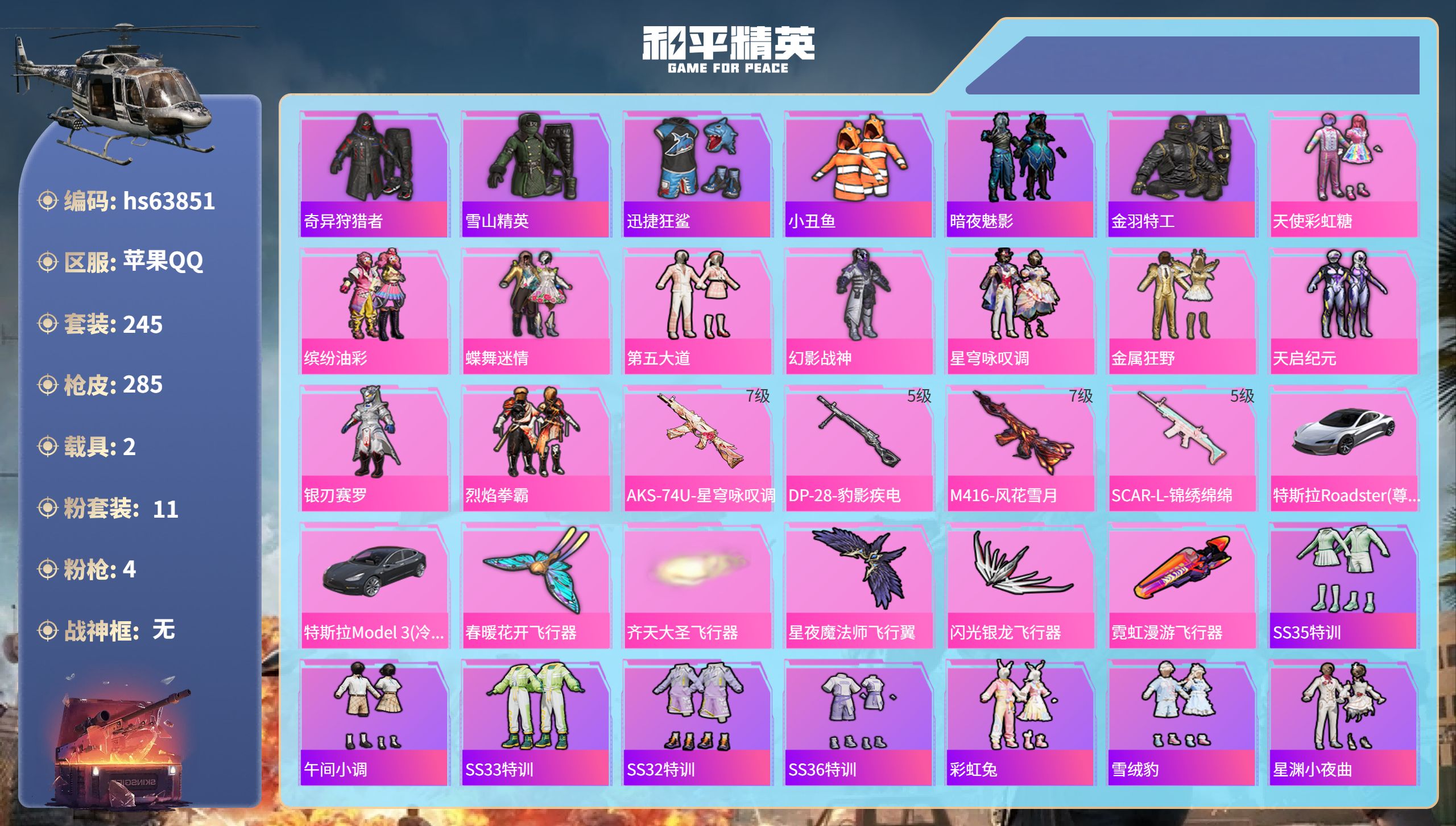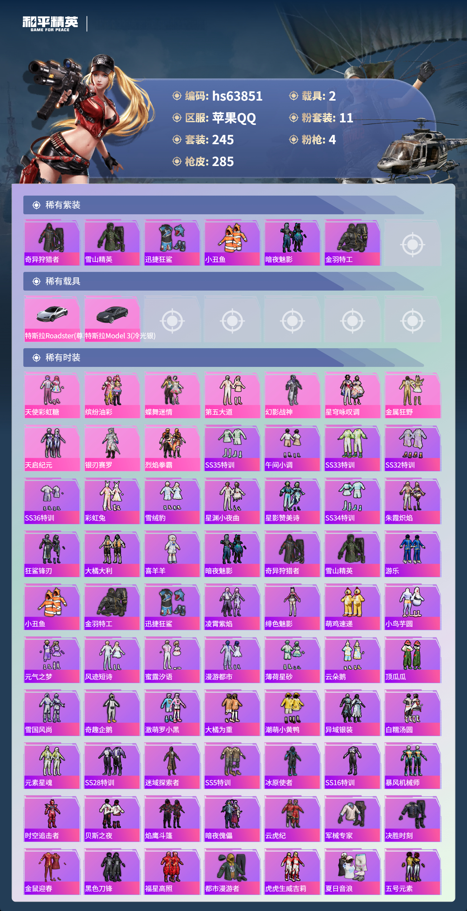 【546412】【可二次】【苹果QQ】大橘为重 特斯拉R尊享铂 特斯拉3银色 韶华初心 金属狂野 极速红龙 赛博空间 银刃赛罗 软嫩糖心蛋 缤纷油彩 影双刃 瑞龙福将 激萌小黄鸭 蝶舞迷情 梦之呓语 激萌罗小黑 团圆交子 VSS-烈焰拳霸 迅捷狂鲨 奇异狩猎者 M762-瑞龙福将 齐天大圣飞行器 潮萌小黄鸭 黑色刀锋 天启纪元 春暖花开飞行器 金羽特工 SCAR-L-锦绣绵绵 M416-风花雪月