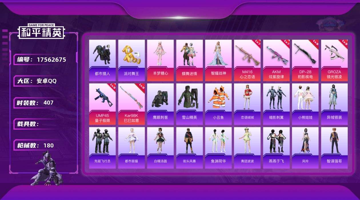【546500】【可二次】【安卓QQ】AKM-炫紫旋律 UMP45-量子极限 漫步者 M416-心之恋语 都市猎人 粉红小猪 派对舞王 蝶舞迷情 雪山精英 镜光幻境飞行翼