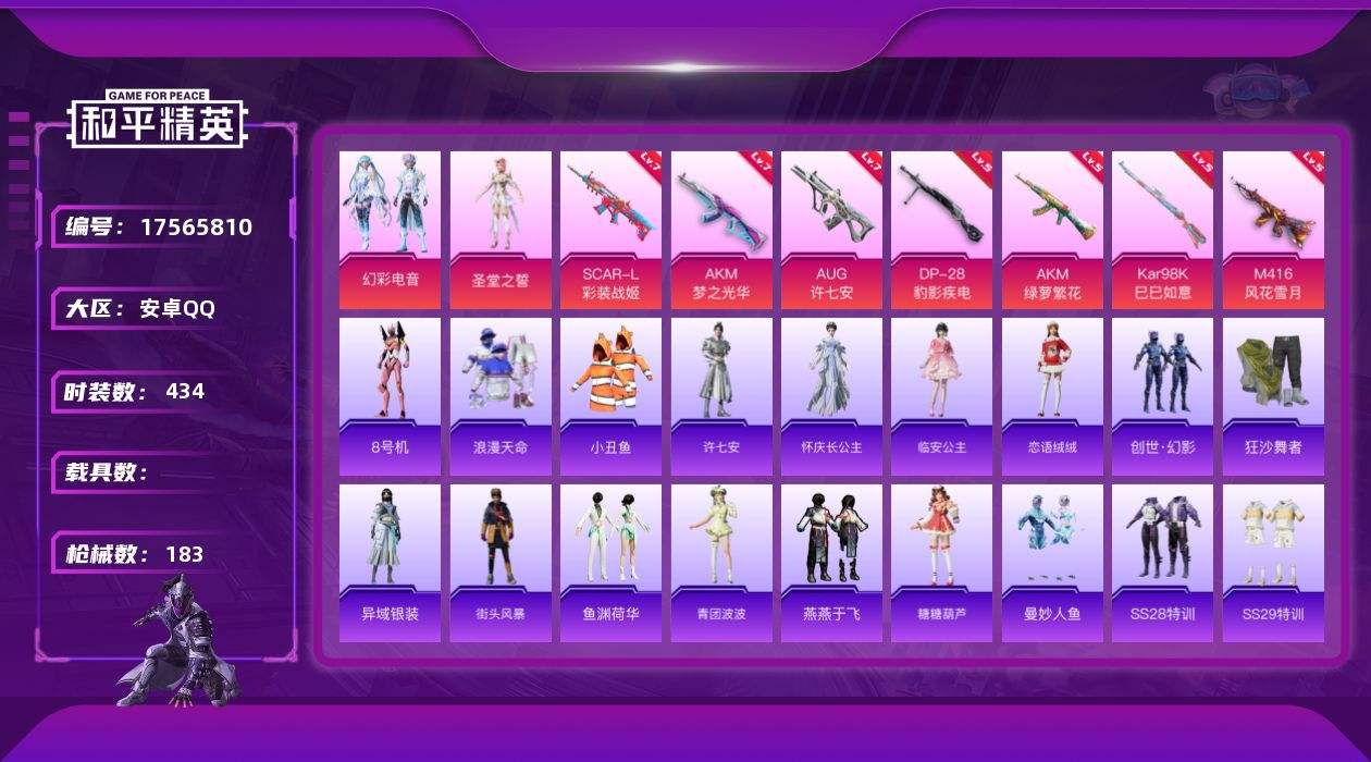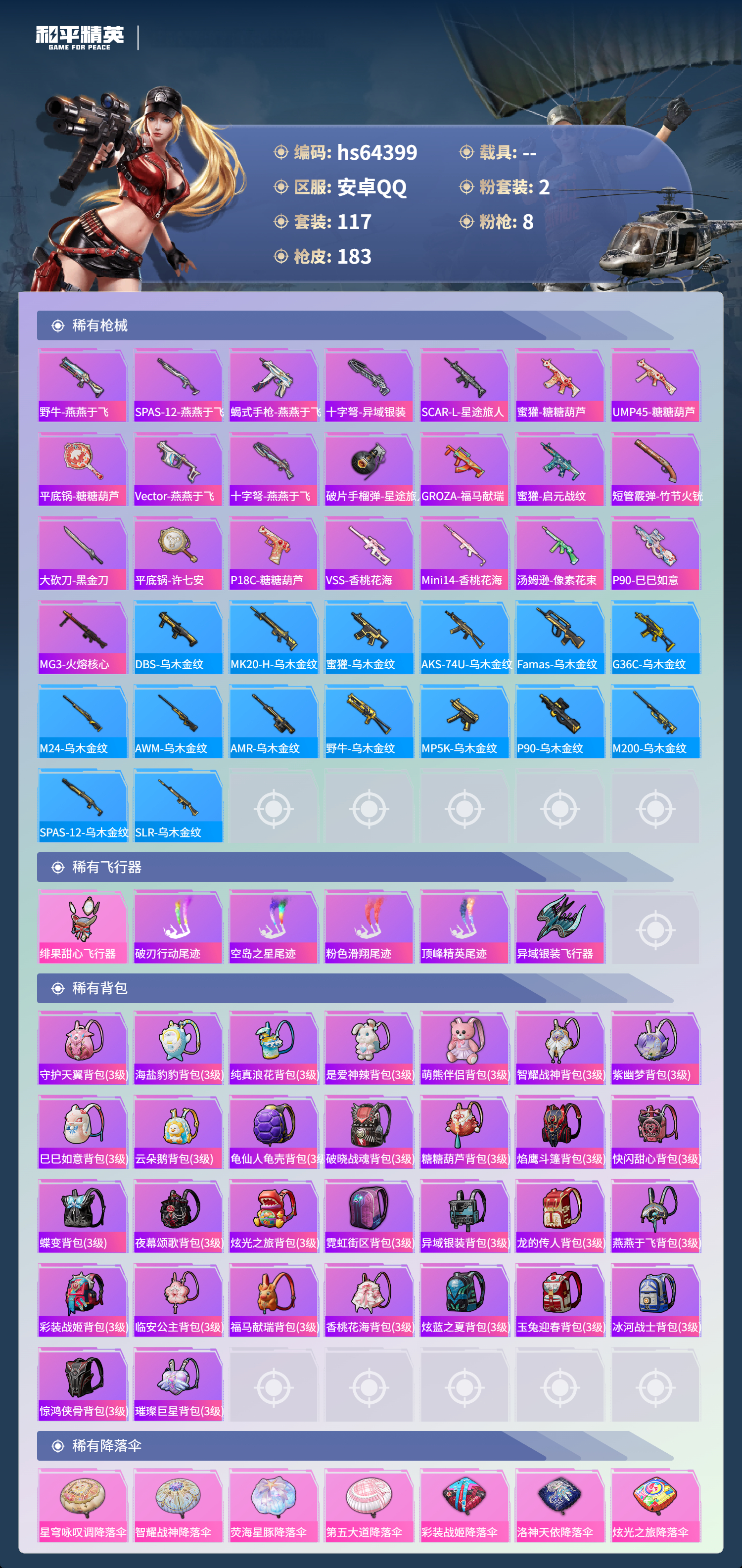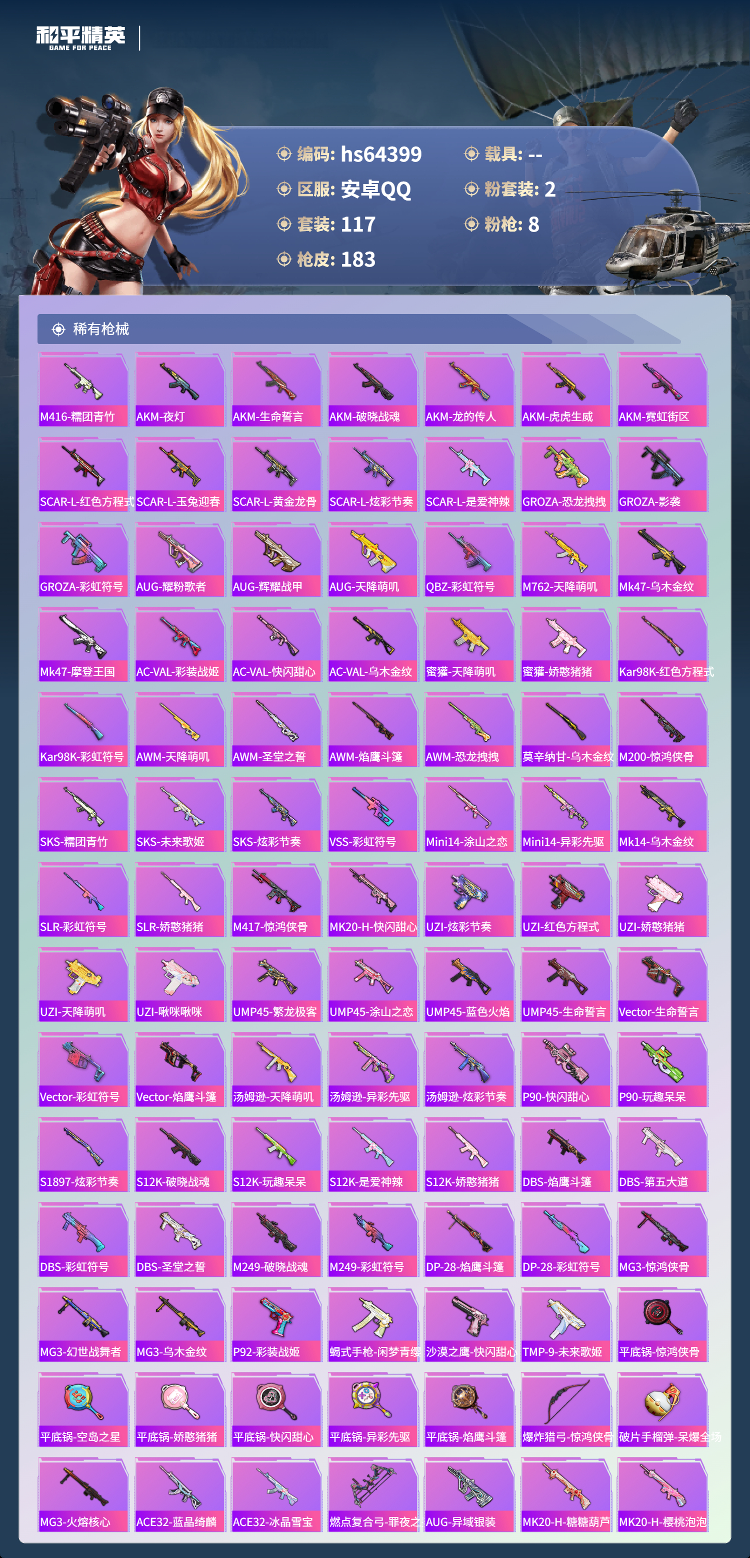 【547041】【不可二次】【安卓QQ】龟仙人 AKM-绿萝繁花 SCAR-L-彩装战姬 M416-风花雪月 AKM-梦之光华 浪漫假日 狂沙舞者 浪漫天命 豚鼠丹丹