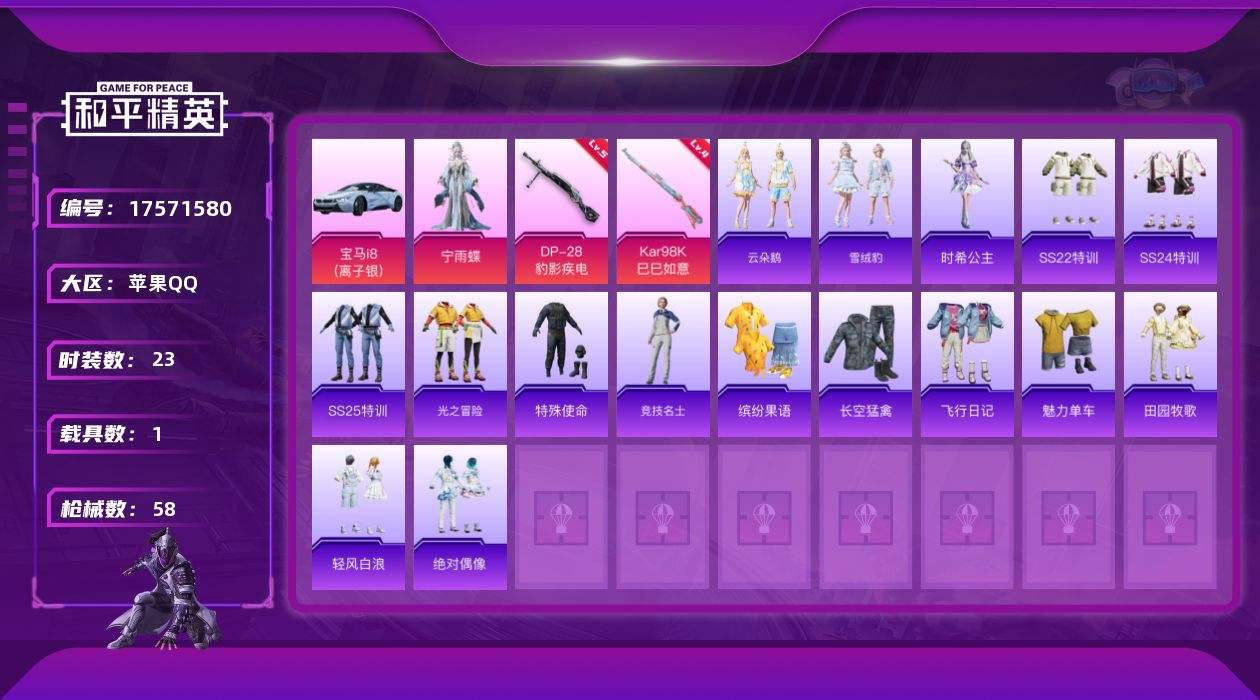 【547503】[17571580]苹果 手Q-1粉装-2特效枪-1载具-0粉色飞行器-14319热力值-1王牌印记-23套装-58枪皮【粉色套装】:角色-宁雨蝶【粉色枪皮等级】:Kar98K-巳巳如意(四级),DP-28-豹影疾电(五级)【粉色载具】:宝马i8(离子银)【粉色枪皮】:Kar98K-巳巳如意,DP-28-豹影疾电