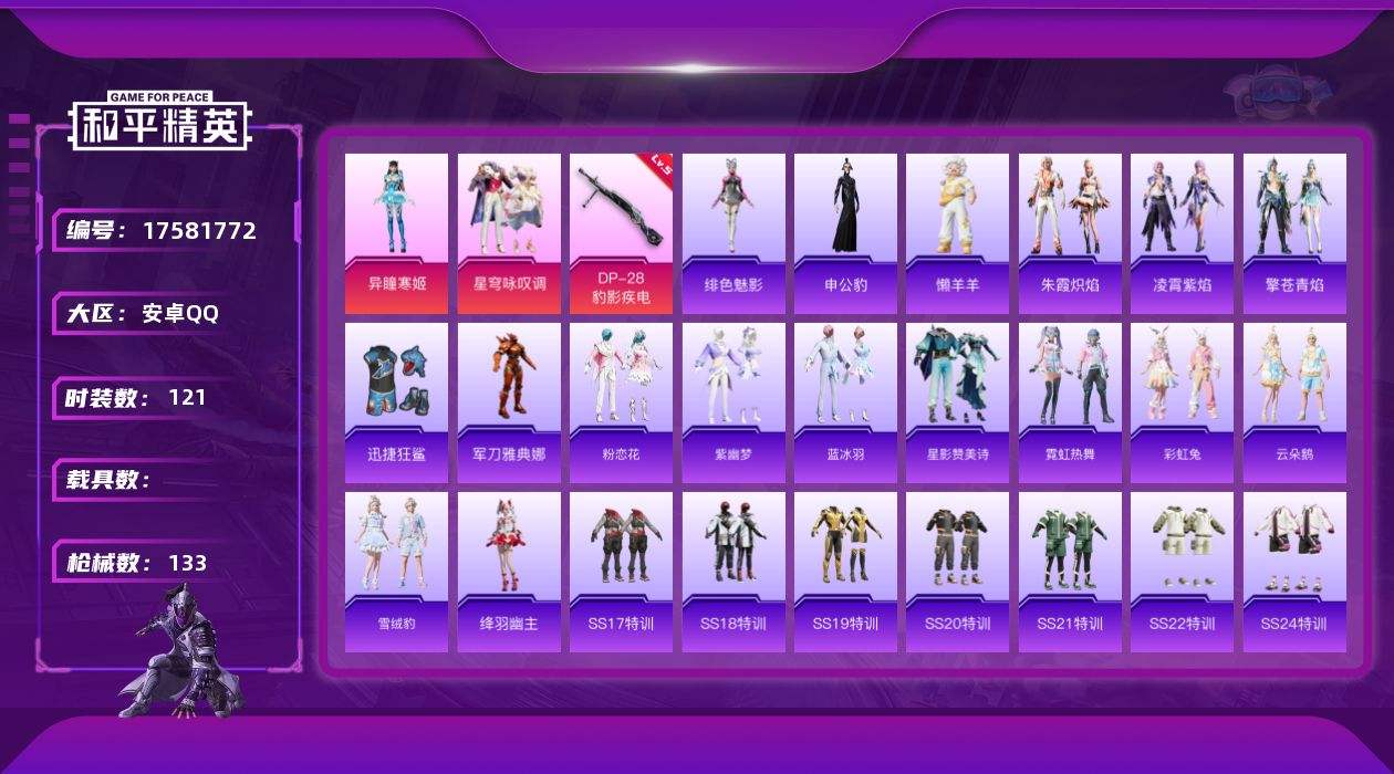 【548405】[17581772]安卓 手Q-无敌战神框-2粉装-4特效枪-0载具-1粉色飞行器-38944热力值-10王牌印记-121套装-133枪皮【热门品类】:角色-军刀雅典娜【粉色套装】:粉装-星穹咏叹调,角色-异瞳寒姬【粉色枪皮等级】:ACE32-萌骑漫游(五级),Mk14-福马献瑞(一级),DP-28-豹影疾电(五级),燃烧瓶-天降桃花(七级)【粉色枪皮】:ACE32-萌骑漫游,M
